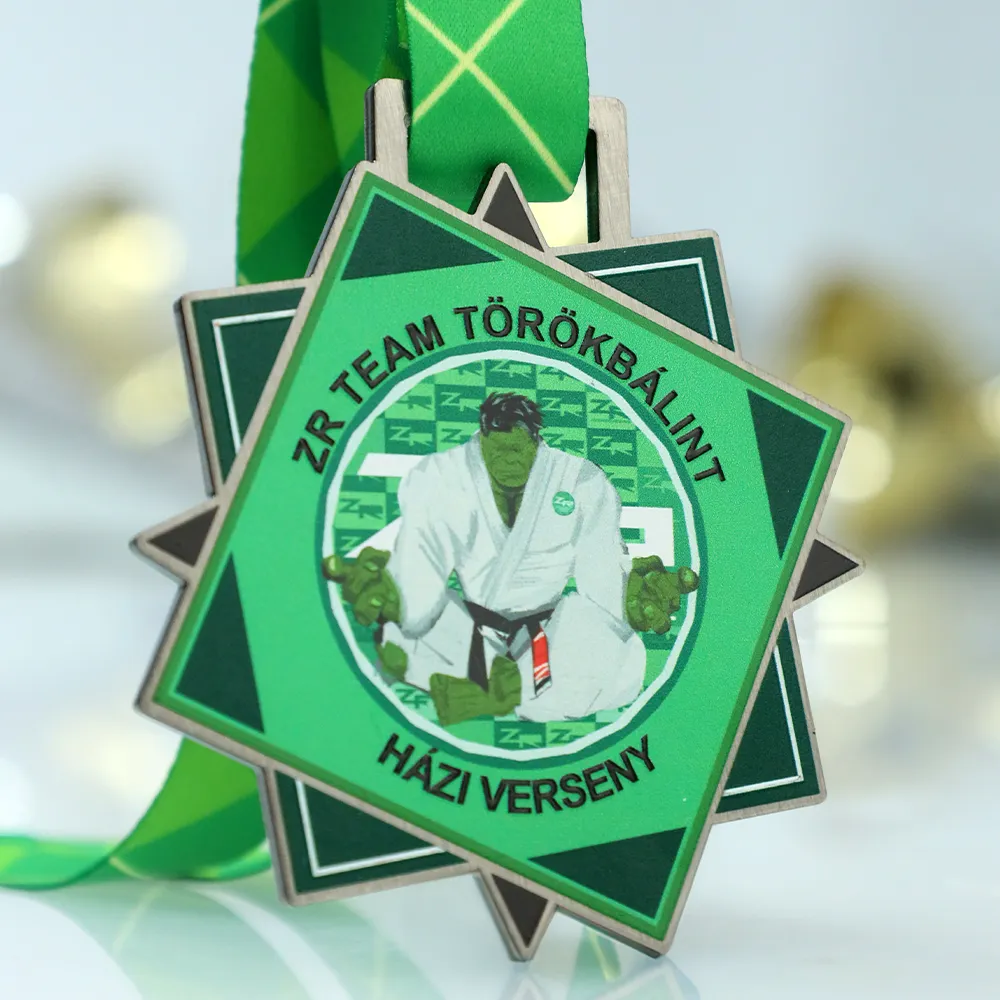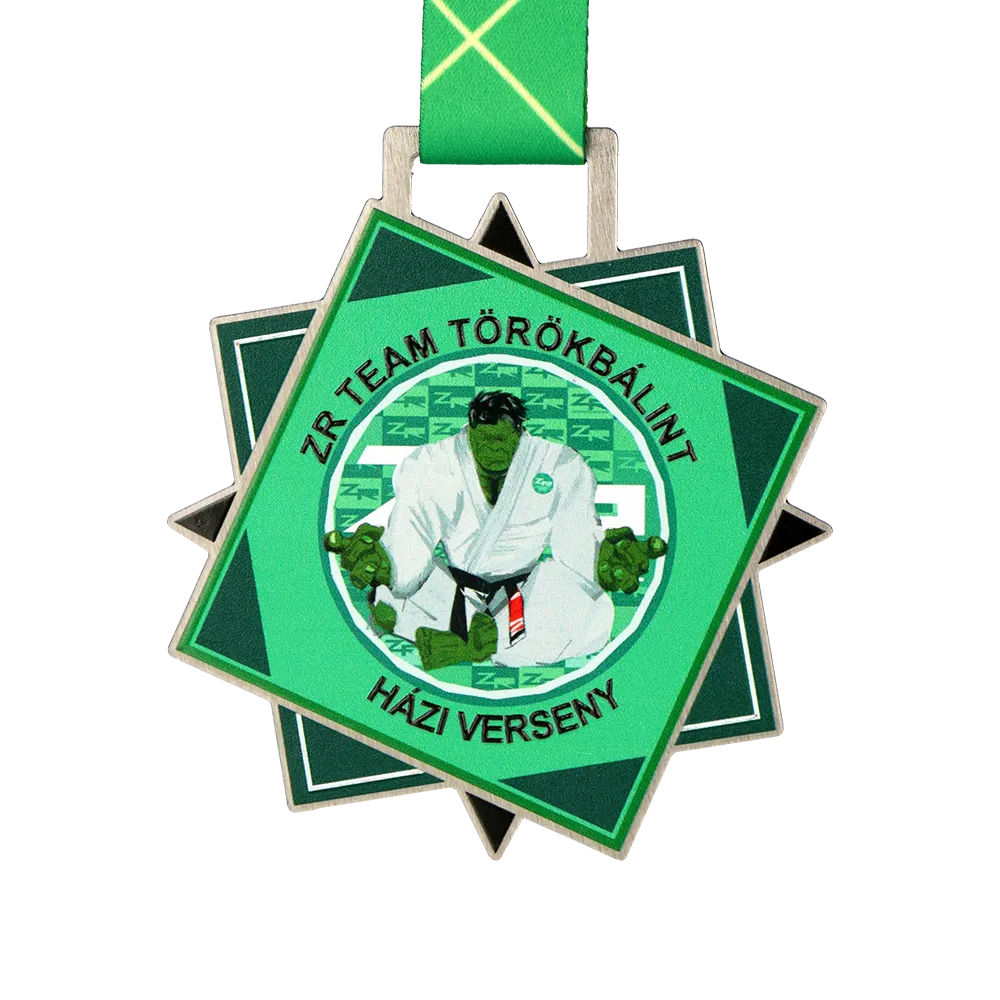 This printed steel medal for Jiu-Jitsu competitions stands out with a precise, polygonal shape achieved through laser cutting. Its surface is adorned with a durable UV print featuring Hulk in a gi.