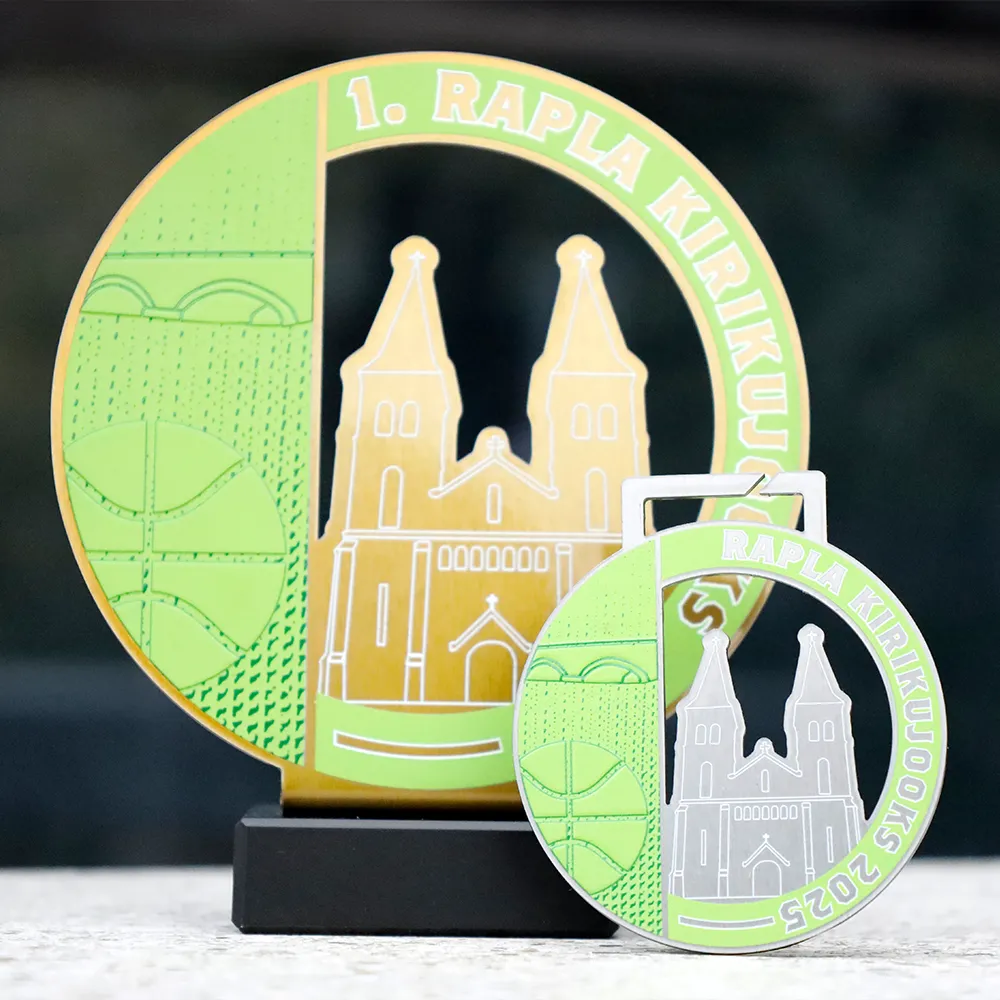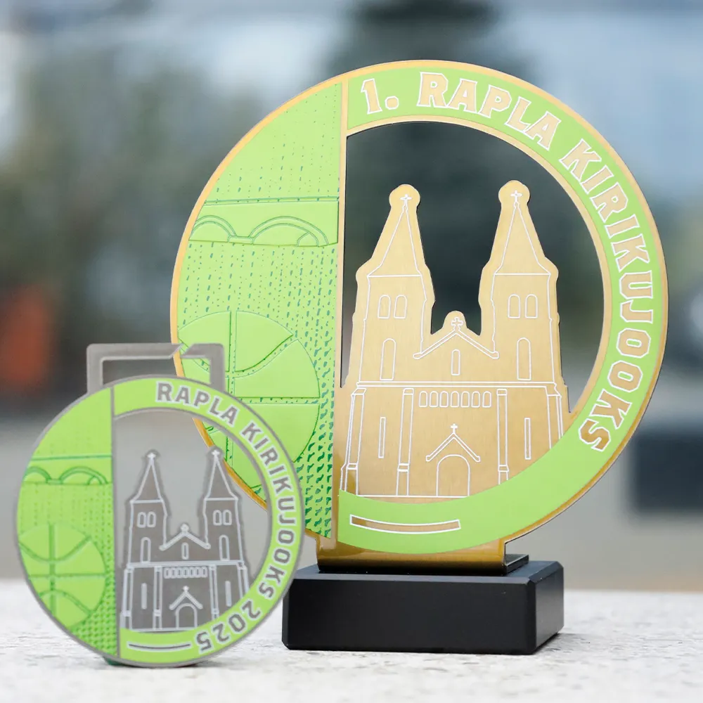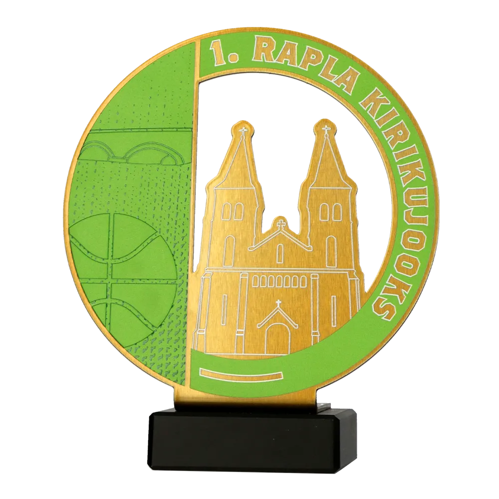 Trophy made of metal, placed on a marble base. The shape was precisely laser cut, and the colourful elements are decorated with UV printing. The design shows a distinctive architectural motif together with a sports graphic, underlining the local character of the event. This sports trophy was prepared for a running competition.