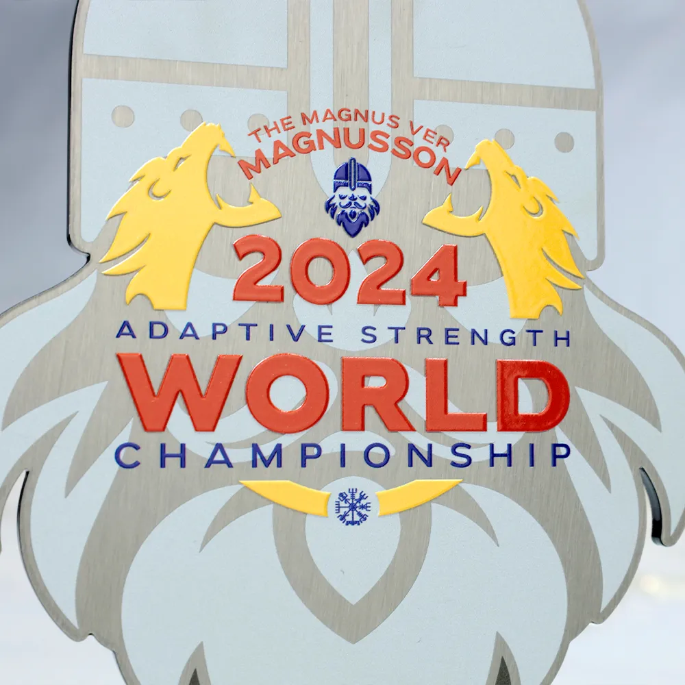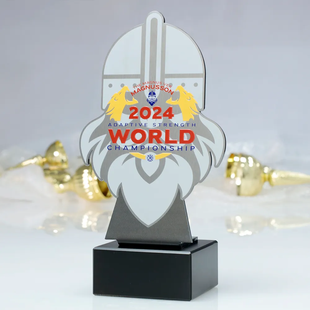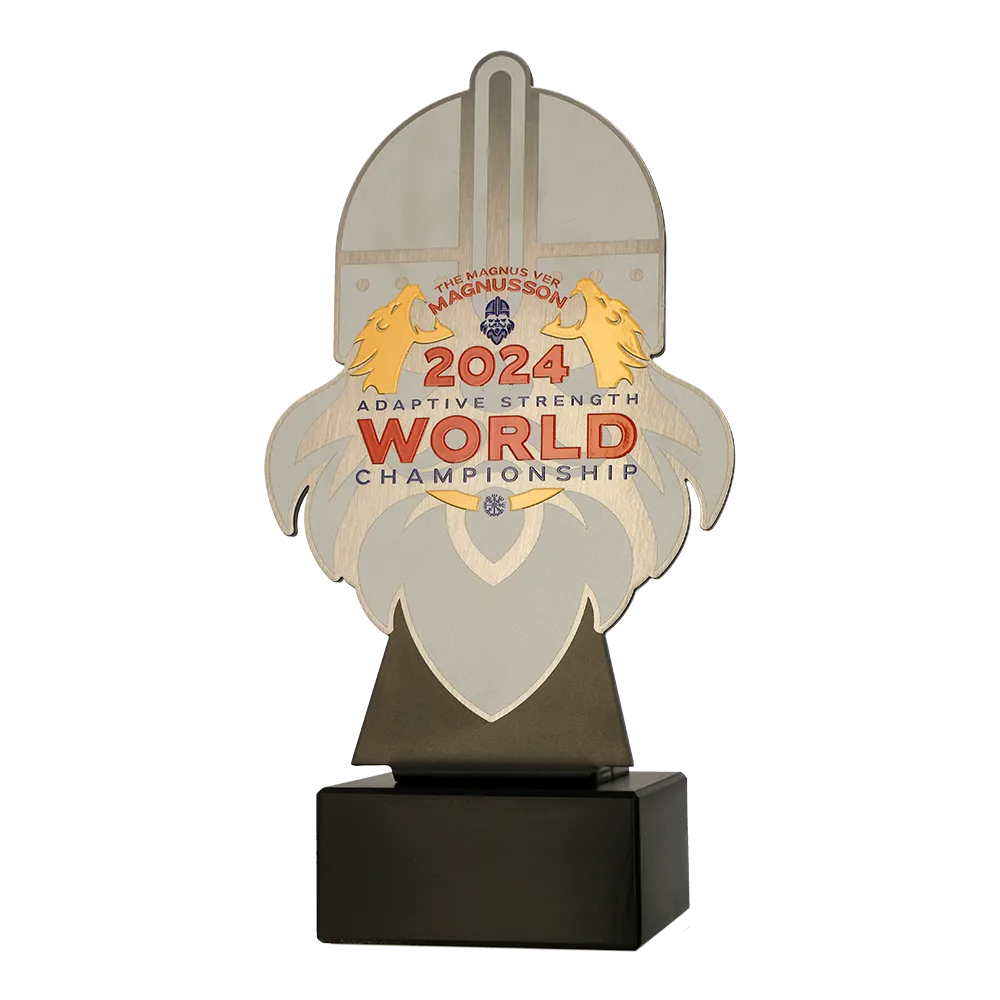 A custom award designed for the 2024 Adaptive Strength World Championships. The laser-cut metal shape of a helmet symbolises strength and resilience. Mounted on an elegant marble base, it serves as a solid and prestigious honour. Personalisation includes the competition name, logo, and event year.