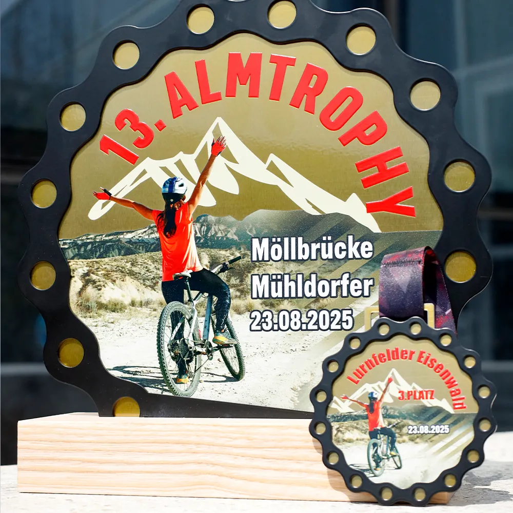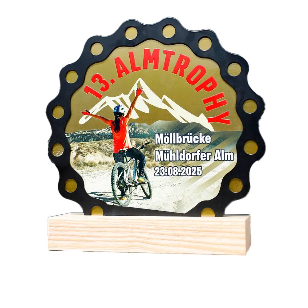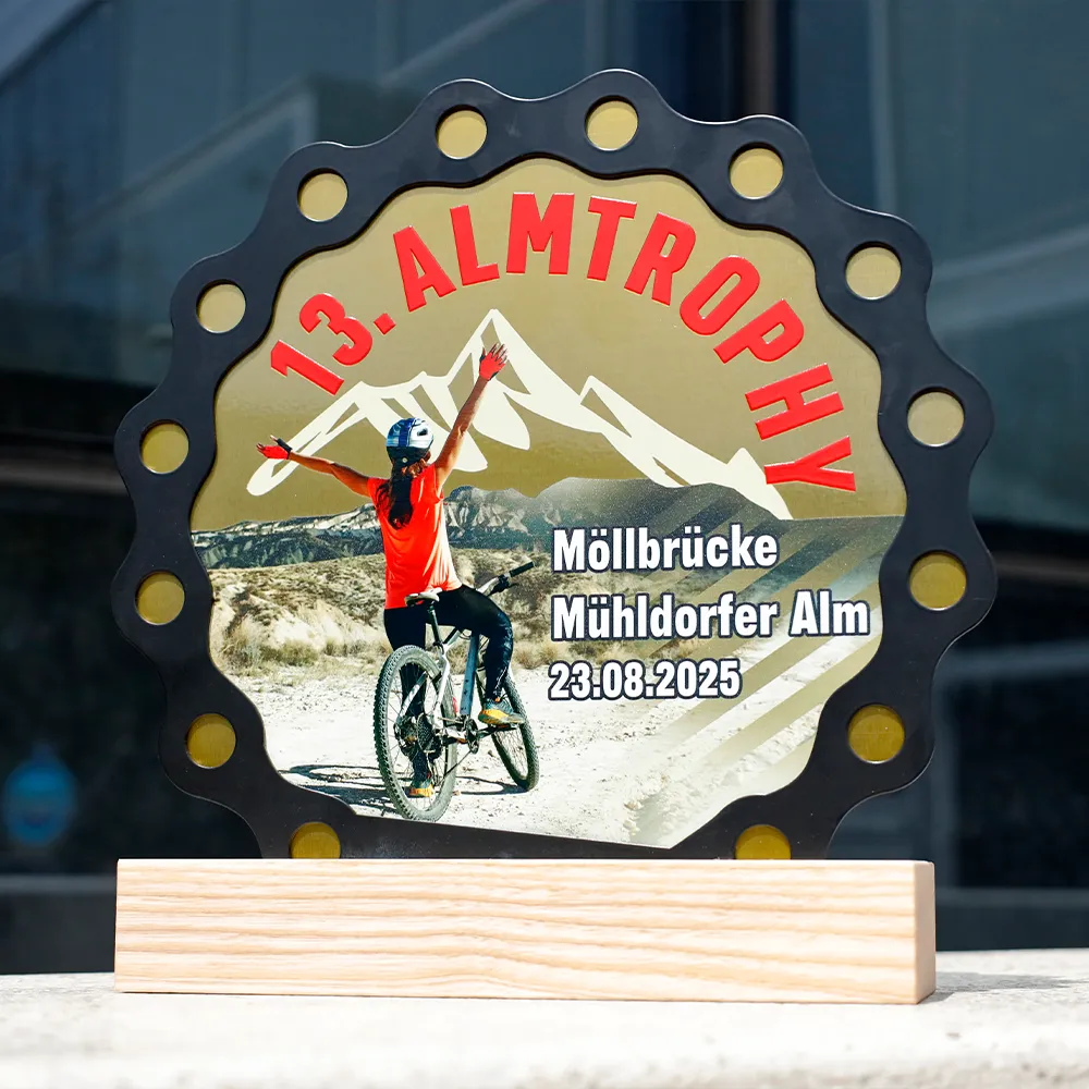 Trophy made of metal, mounted on a wooden base. The shape was laser cut, and colourful graphics and inscriptions were applied with UV printing. The design is shaped like a bicycle cogwheel, with printed mountains and a cyclist, reflecting the theme of the event. This bespoke award was prepared for a cycling competition.