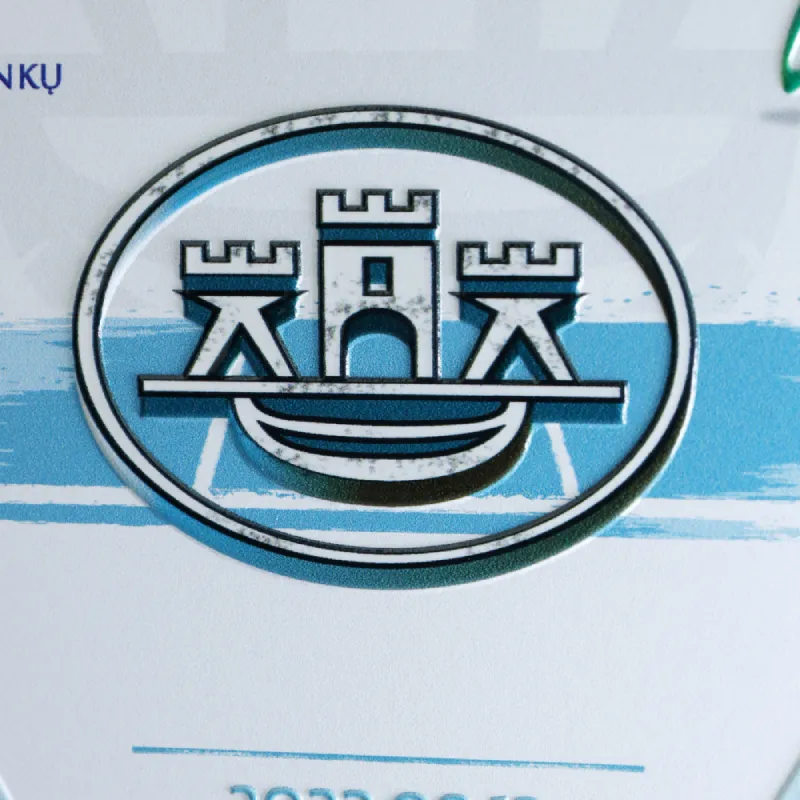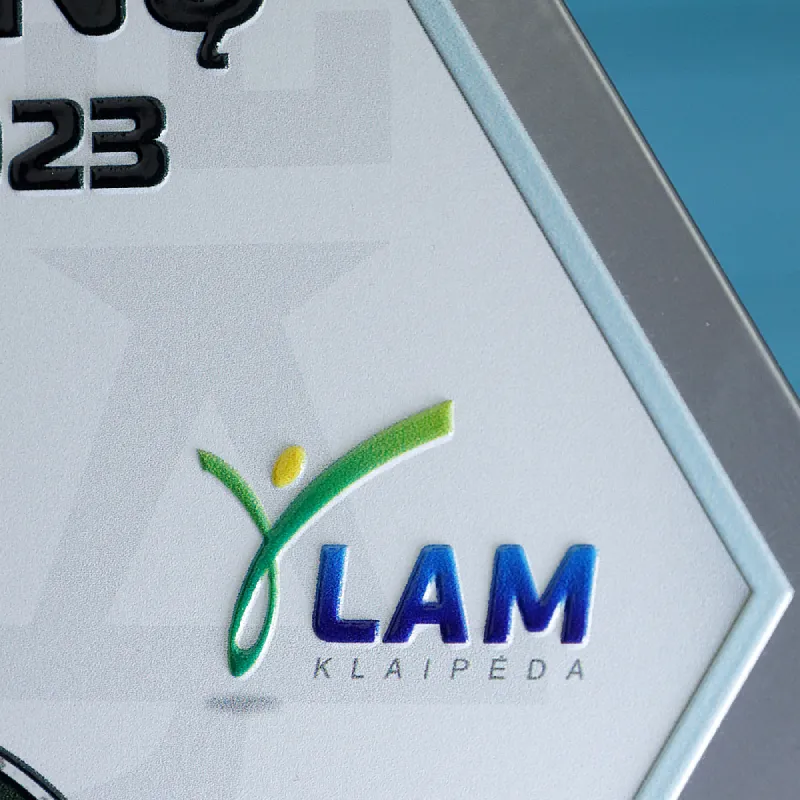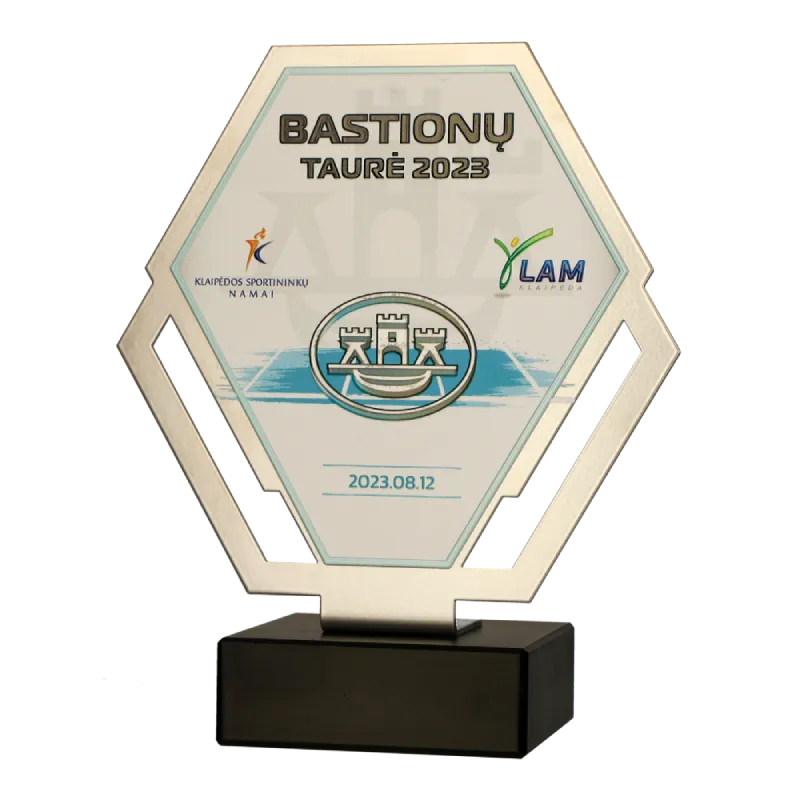 The running trophy we created for the Bastionų Taurė 2023 is hexagonal with laser-cut sides. The graphics include the coat of arms of Klaipėda and the name of the event.