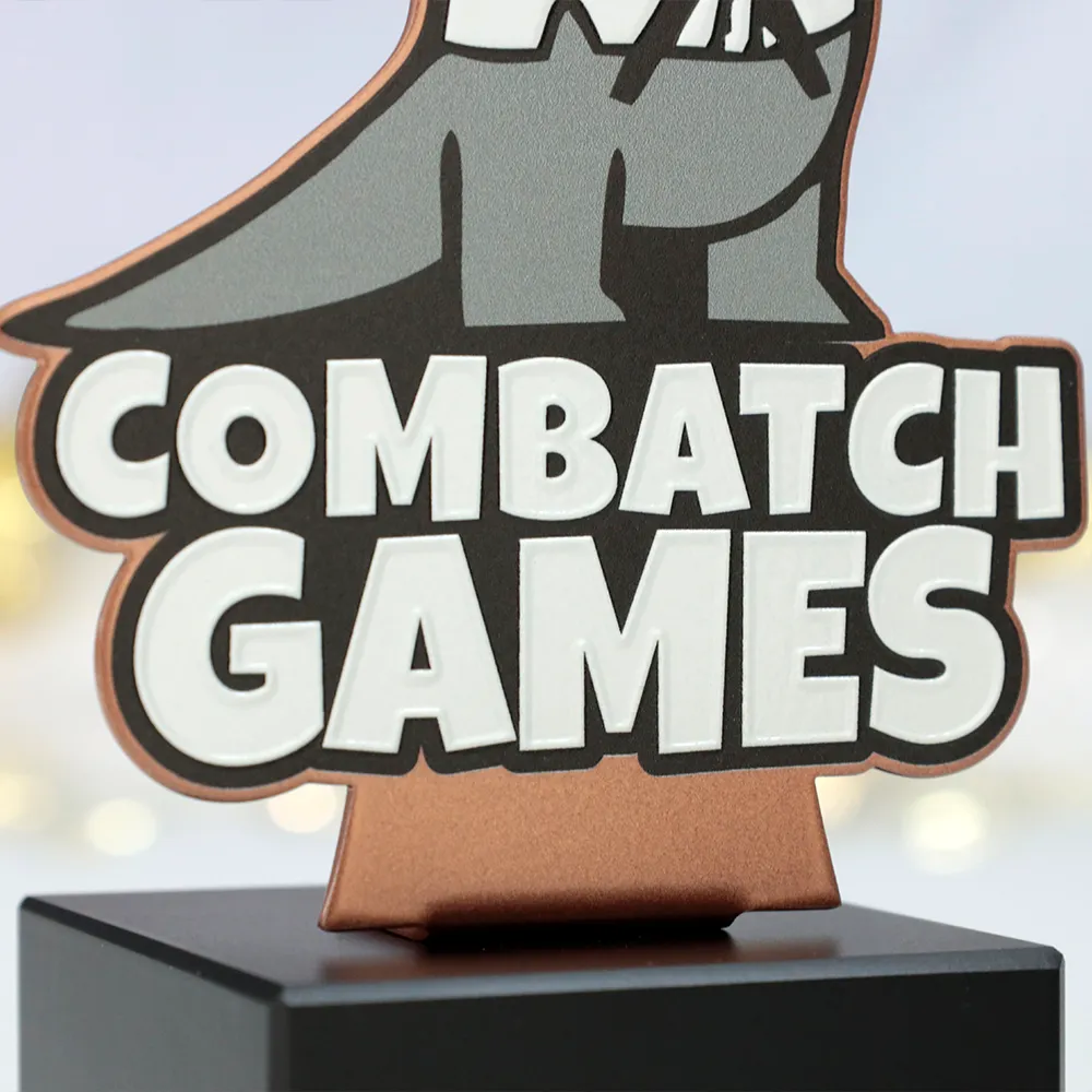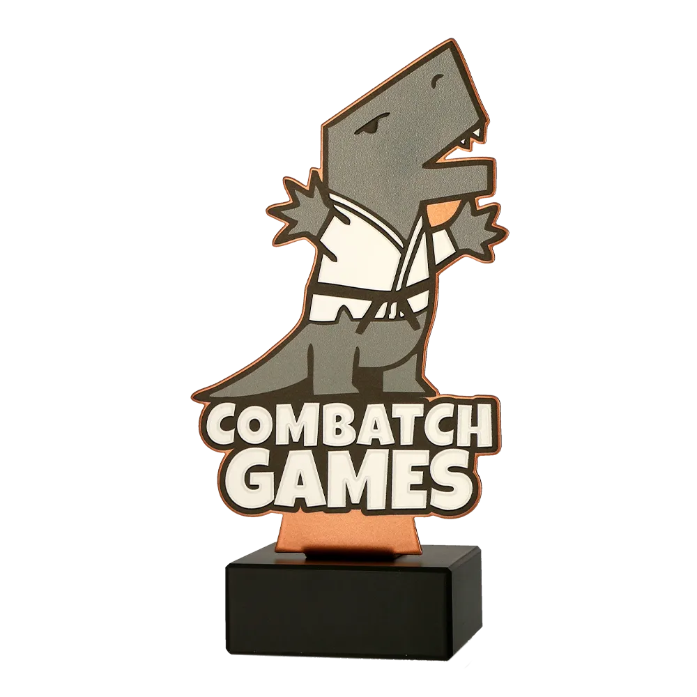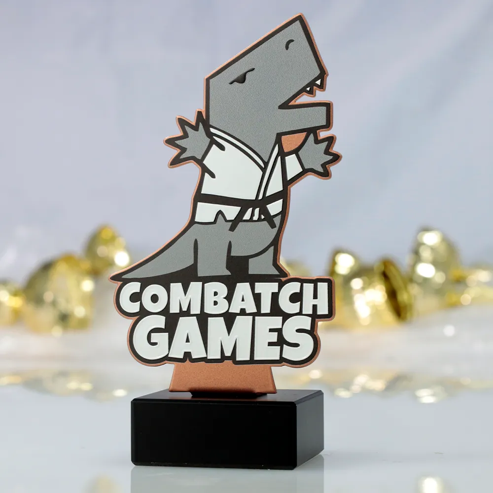Judo trophy designed for the “Combatch Games” event. It is a symbol of recognition and a reward for participants showcasing outstanding judo skills. The trophy features a humorous depiction of a dinosaur in a judo uniform. At the bottom, the event name is displayed in bold, three-dimensional text. This modern and fun trophy is perfect for sports events with an element of humour.