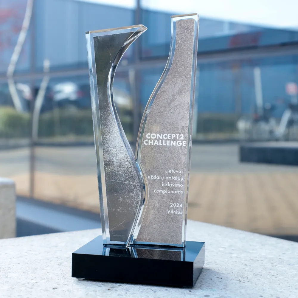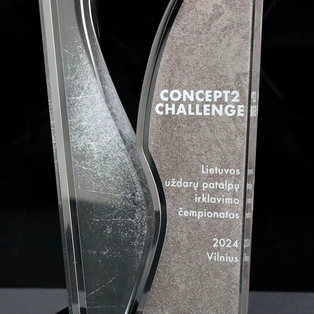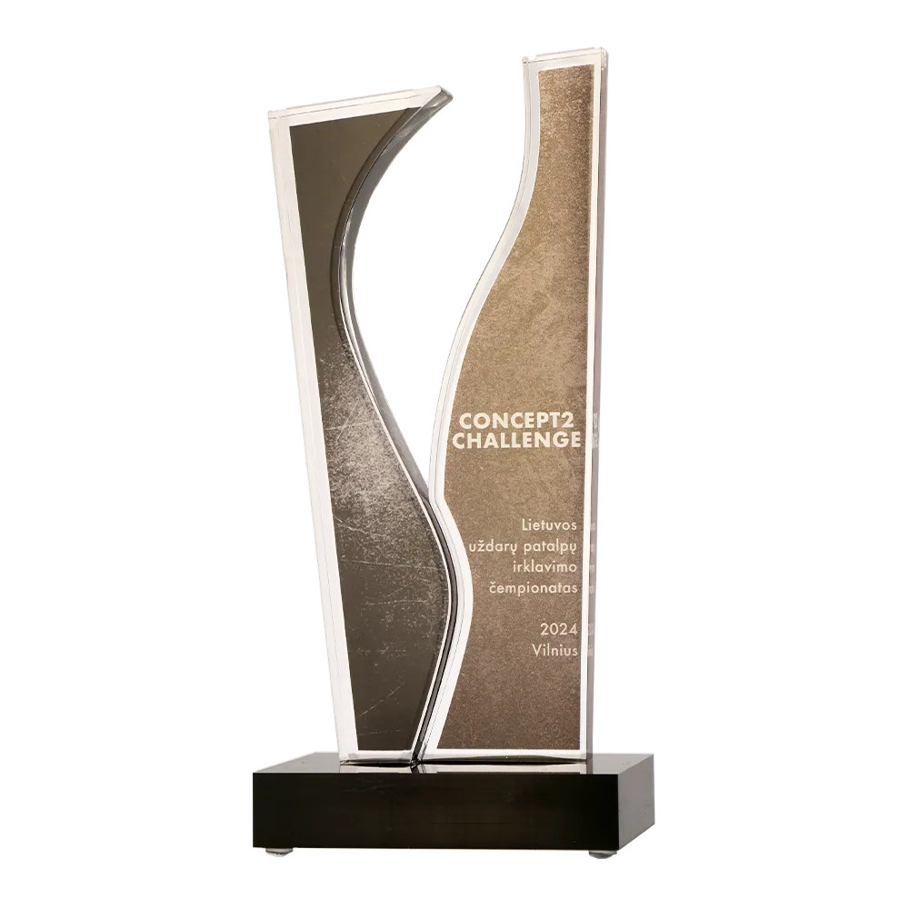 An acrylic rowing trophy designed for the Lithuanian Indoor Rowing Championships “Concept2 Challenge 2024” in Vilnius. The award has an elegant, modern design with two slim, curved panels. One part features a metallic finish, while the other is adorned with subtle printing. The inscription includes the championship name and date, adding a personal touch. Modern and minimalist, this trophy exudes elegance and class, reflecting the prestige of the competition.