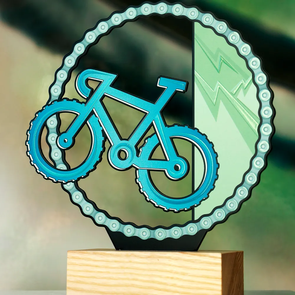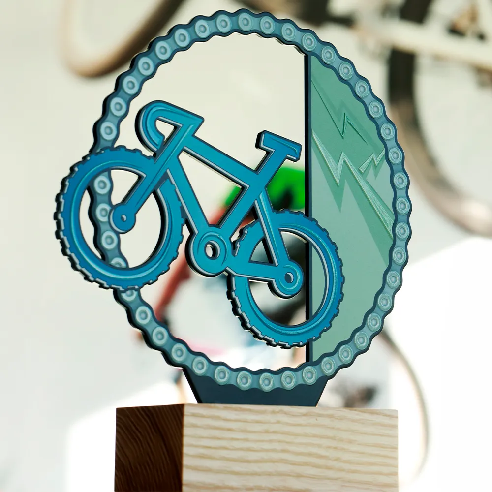 A cycling trophy designed for Cycling Adventure. The award's shape was precisely laser-cut, ensuring a high-quality finish. This trophy combines metallic elements with a wooden base. Its unique look is credited to colourful embellishments, created using UV printing techniques.