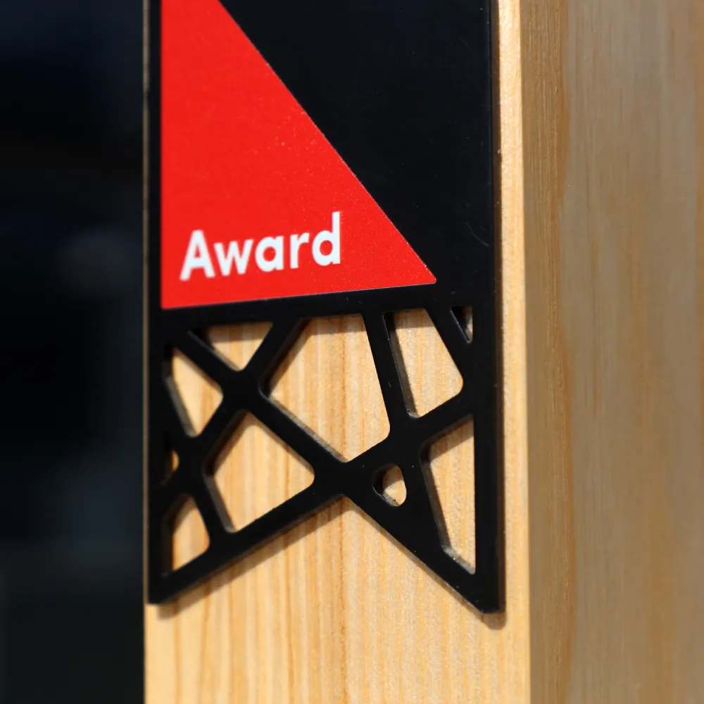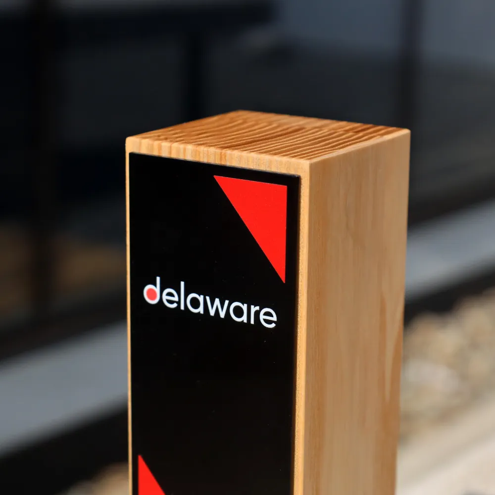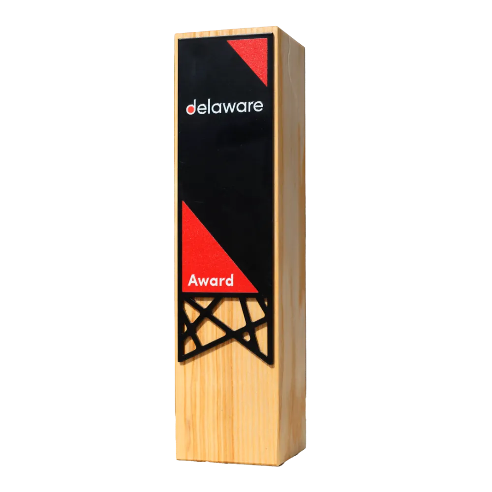 A custom trophy we designed for Delaware. The front features the logo, red triangles and text, whilst the overall form is a slender cuboid. The body is made of wood, with a black metal panel on the front, printing and a decorative, geometric cut-out insert at the bottom. The award is free-standing; we can adapt this design to the name and branding of your event.
