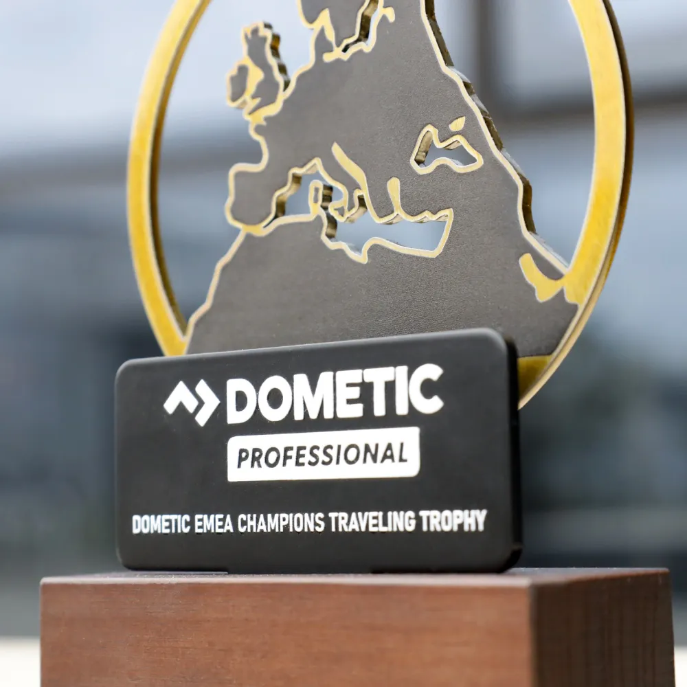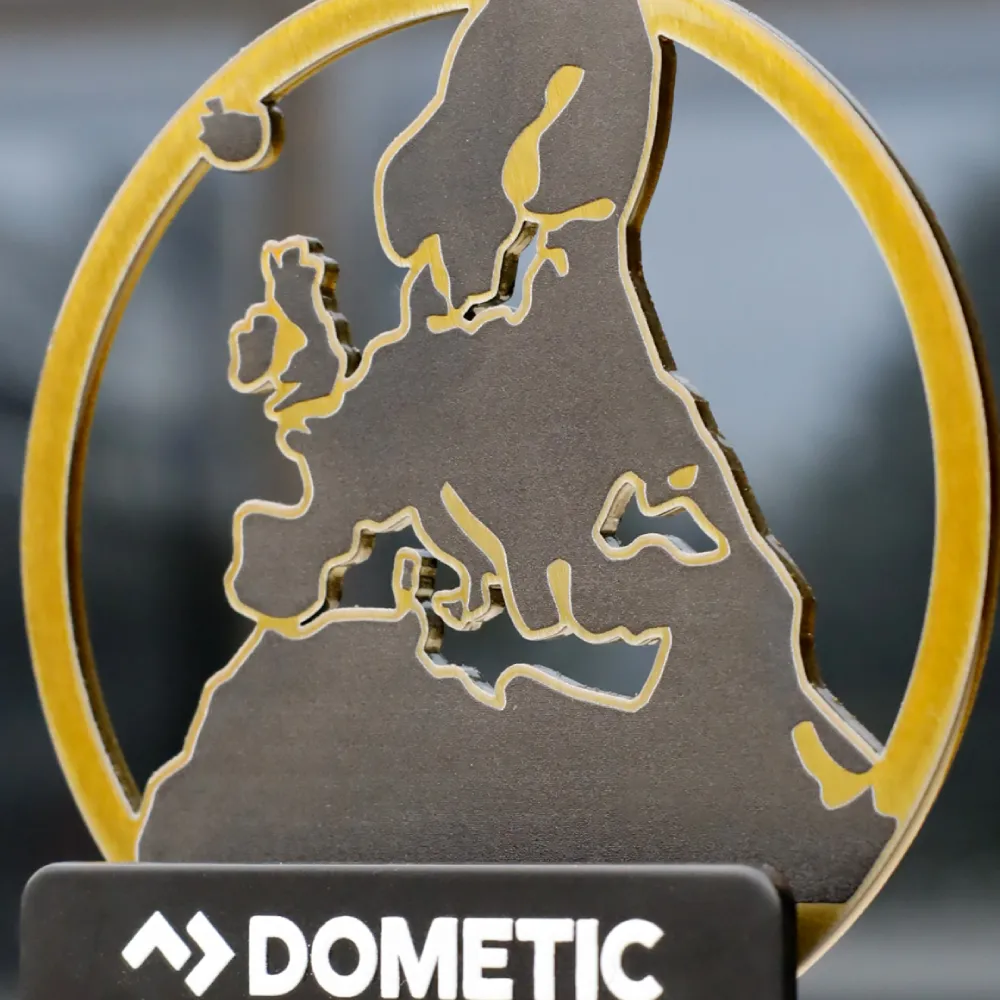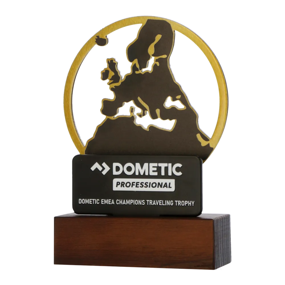 A personalised trophy with a metal motif of the map of Europe on a wooden base, designed for the Dometic EMEA Champions Traveling Trophy. The UV-printed logo and event name give the trophy an elegant appearance, while the precisely cut map emphasises its prestigious character.