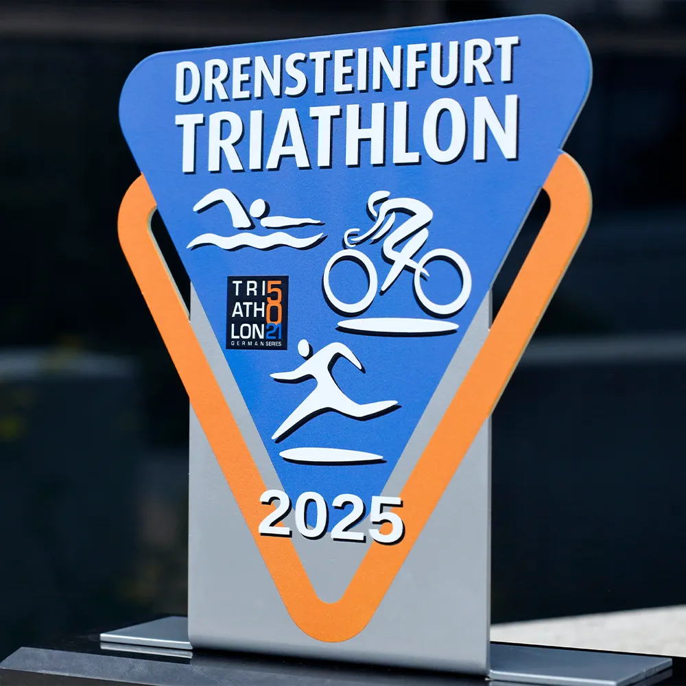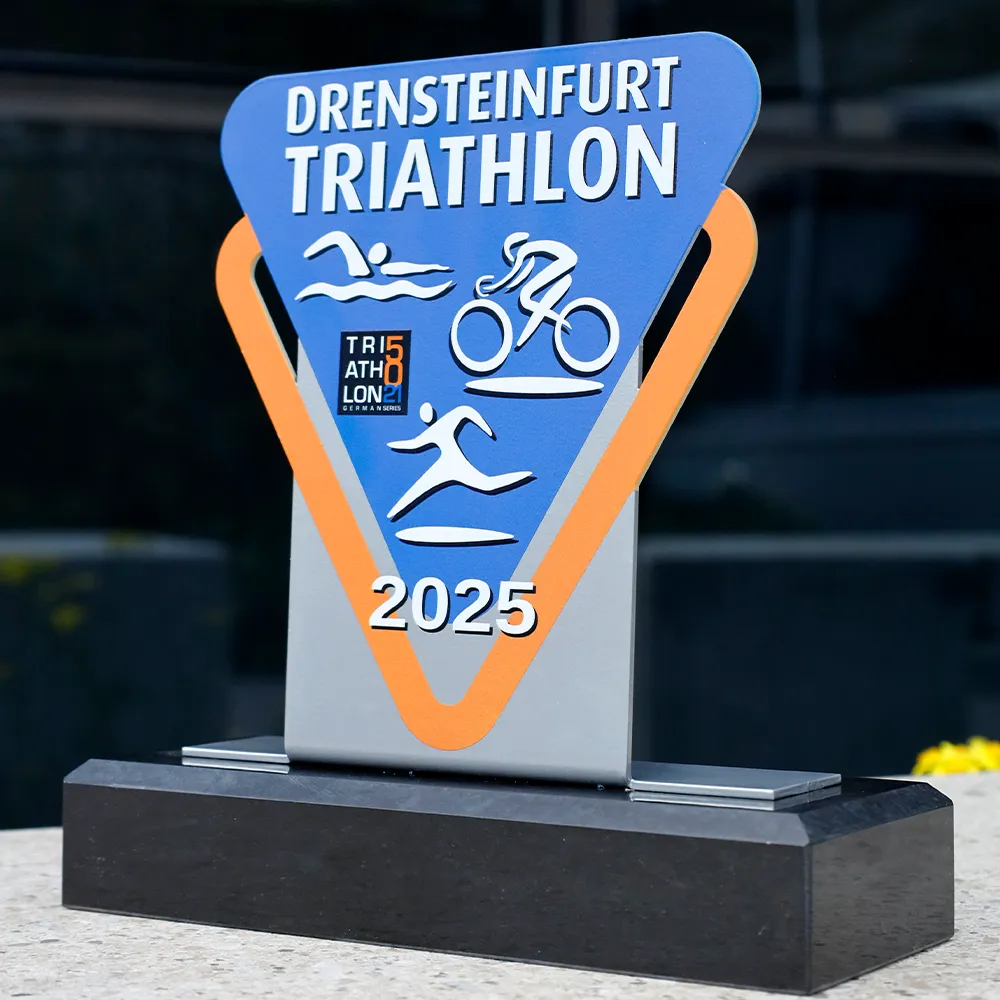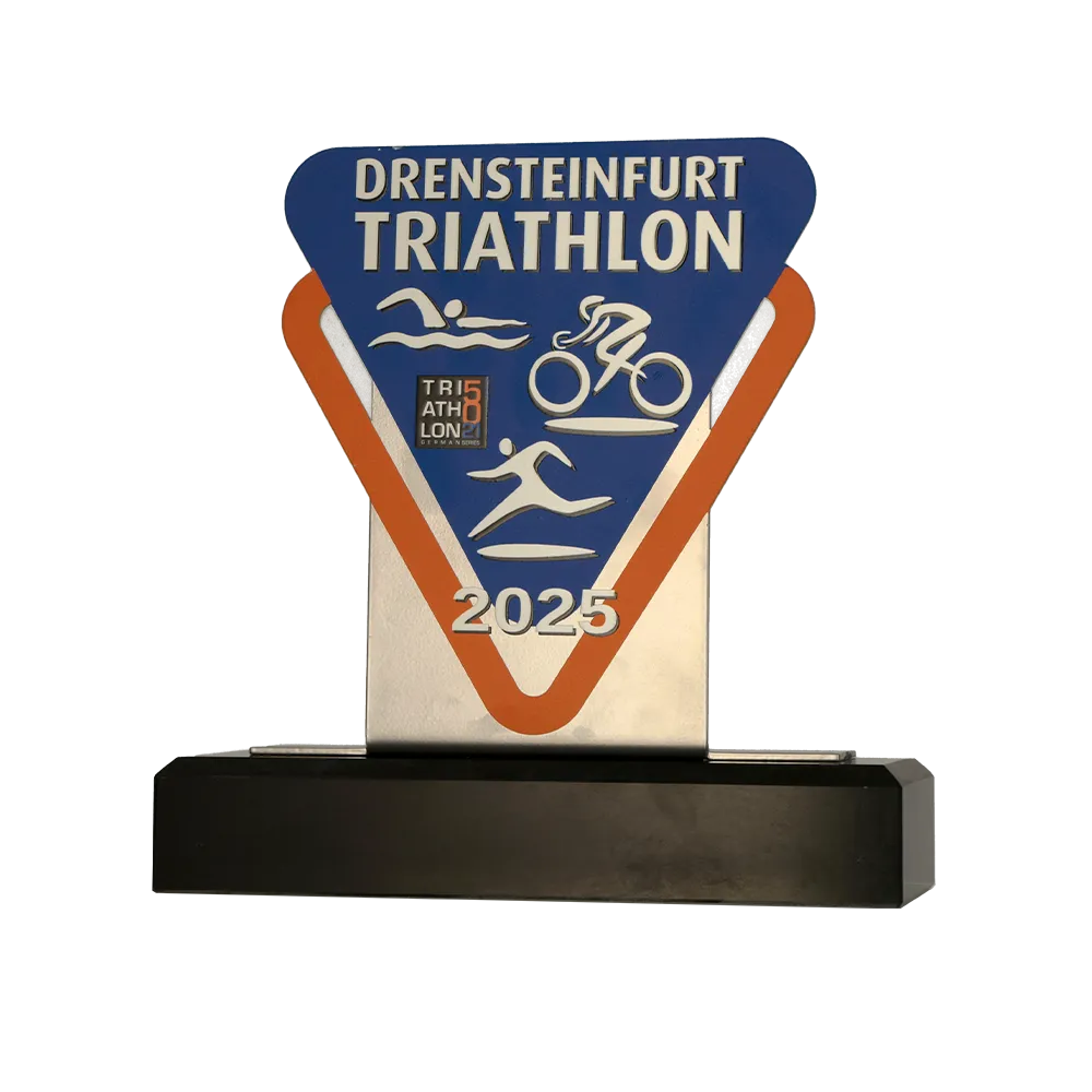 Trophy made of metal, mounted on a marble base. The shape was laser cut, and colourful elements and inscriptions were applied using UV printing. The triangular design shows the symbols of swimming, cycling and running, reflecting the character of the event. This sports trophy was prepared for a triathlon competition.