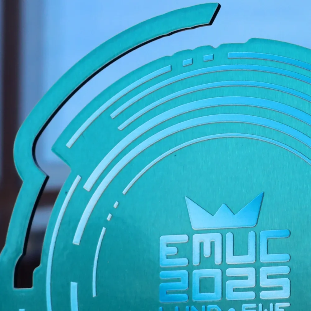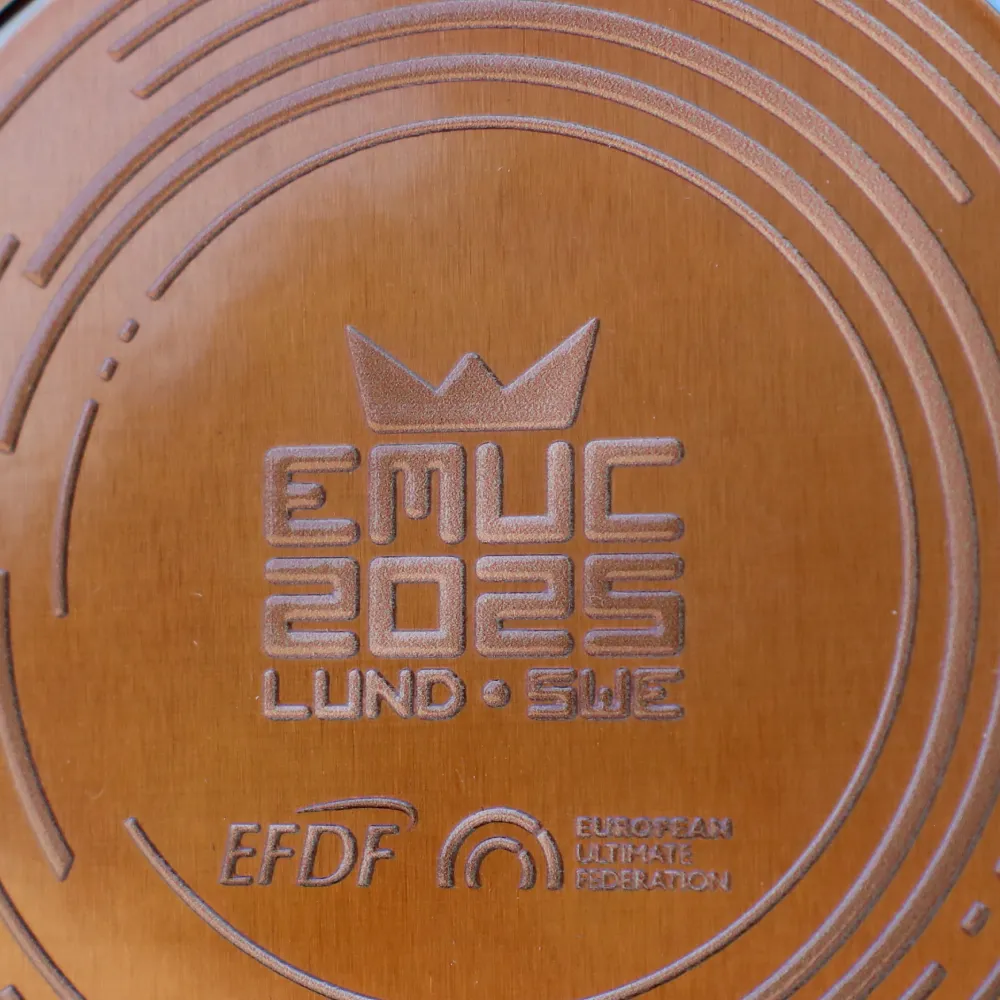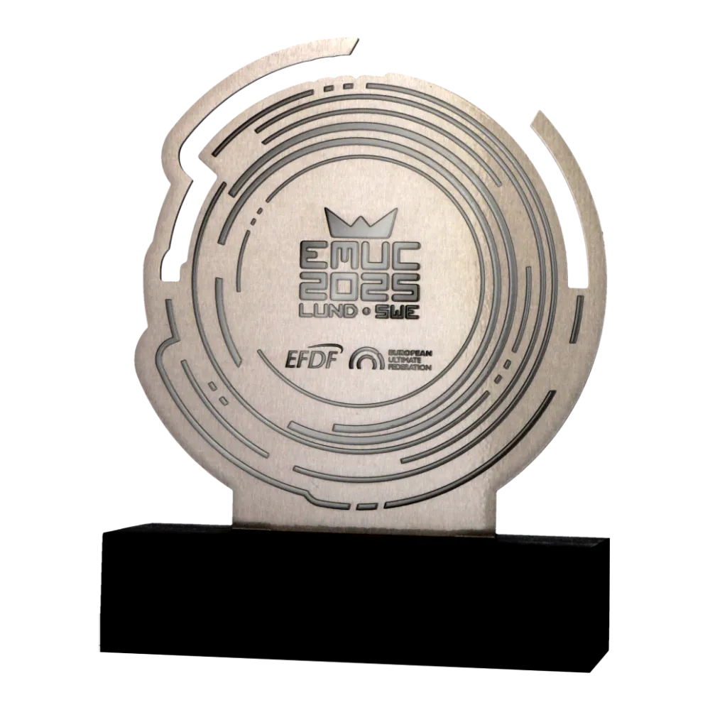 This custom sports trophy was prepared for the European Masters Ultimate Championships (Frisbee), EMUC 2025 in Lund, Sweden. It is made of metal with a satin finish, set on a dark base. The shape is innovative, with laser-cut elements that give it a dynamic, almost futuristic look. The central motifs, including the crown and the inscriptions EMUC 2025 Lund • SWE and the EFDF logos, were applied using UV printing technology, highlighting the character of the event.