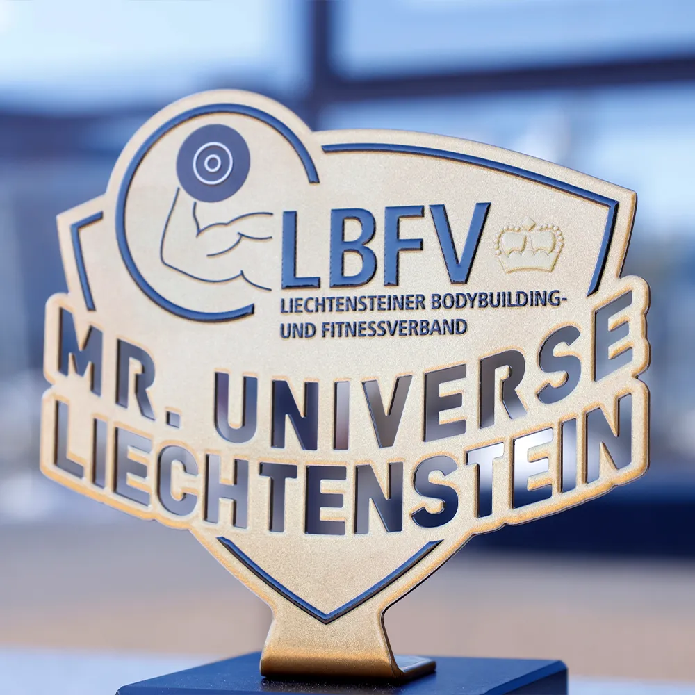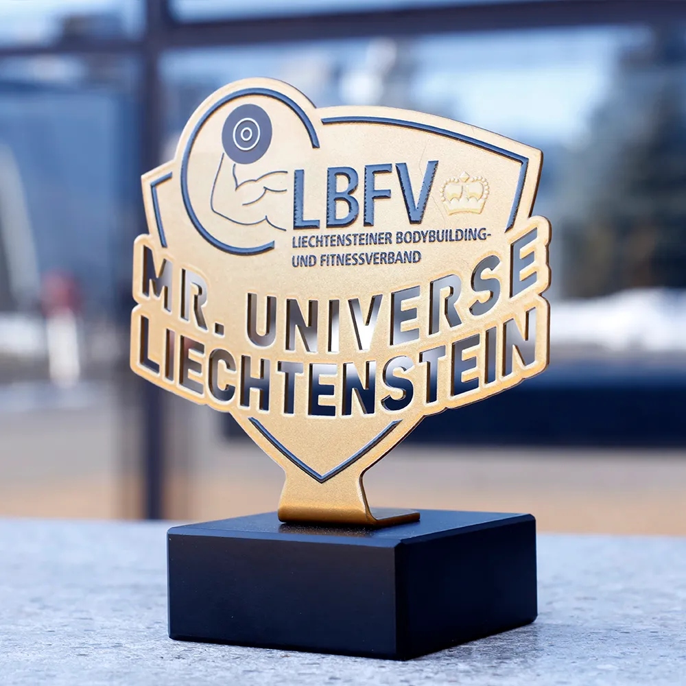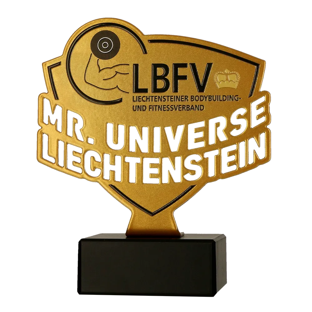 A bodybuilding trophy made of metal on a marble base. Created for the Mr. Universe Liechtenstein bodybuilding competition, organised by the Liechtensteiner Bodybuilding und Fitnessverband (LBFV). It features a gold colour with black details and a raised graphic depicting a barbell and the organisation’s logo.
