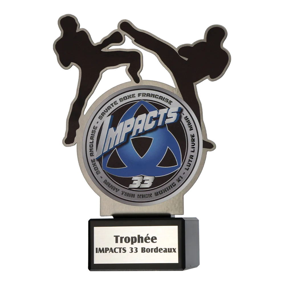 An original sports trophy designed for a Brazilian Jiu-Jitsu event. The trophy was made of steel, laser-cut, and decorated with black-and-white UV printing. A dynamic design featuring a pop-culture-inspired figure draws attention and fits perfectly with the event’s character. The entire piece is mounted on an elegant marble base.