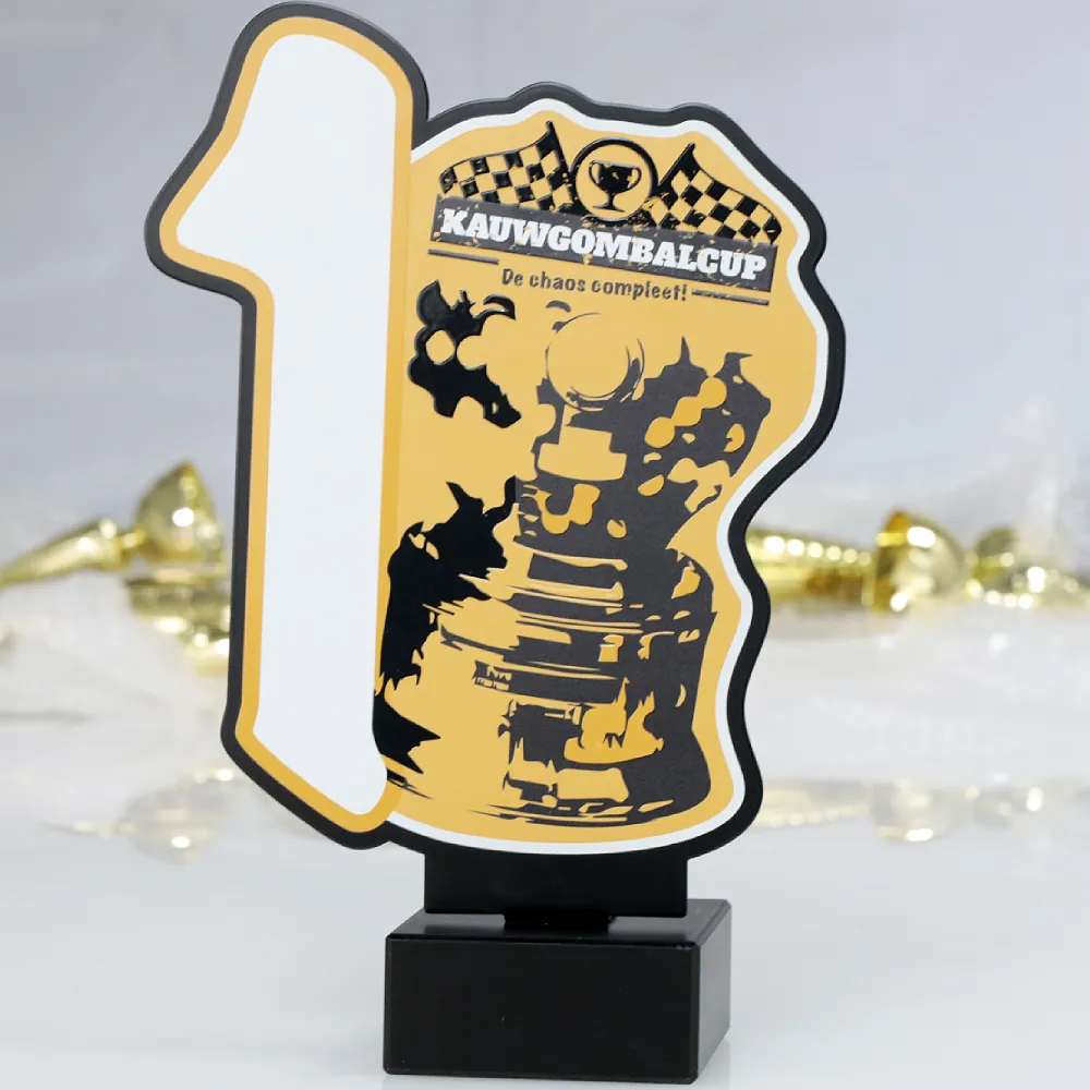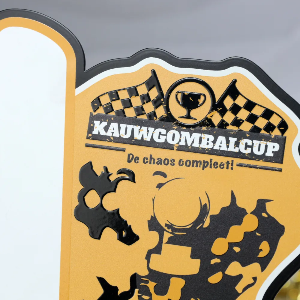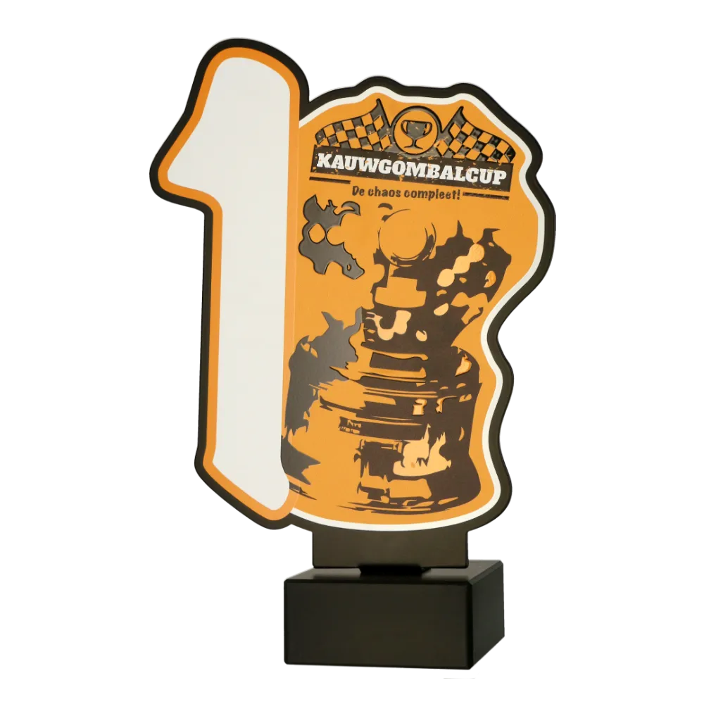 An exceptional motorsport trophy designed for the Kauwgombalcup event, known for its energetic and dynamic atmosphere. The main feature is a graphic of a cup and distinctive event elements set against a vibrant orange background.