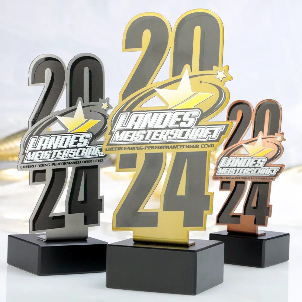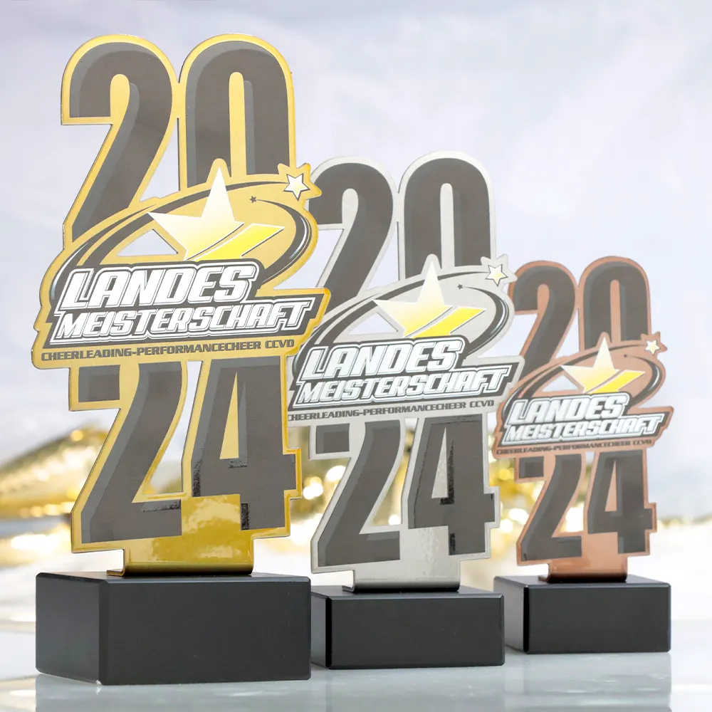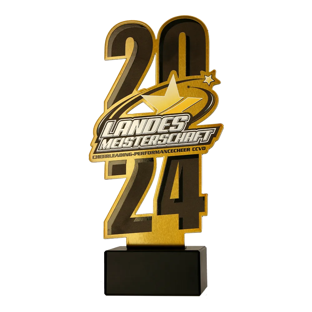 Personalised trophy created for the regional cheerleading championships “Landesmeisterschaft Cheerleading 2024”. Made of metal with UV printing, it ensures durable colours and sharp details. The solid marble base adds stability and an exclusive character to the design.