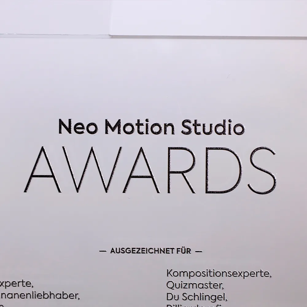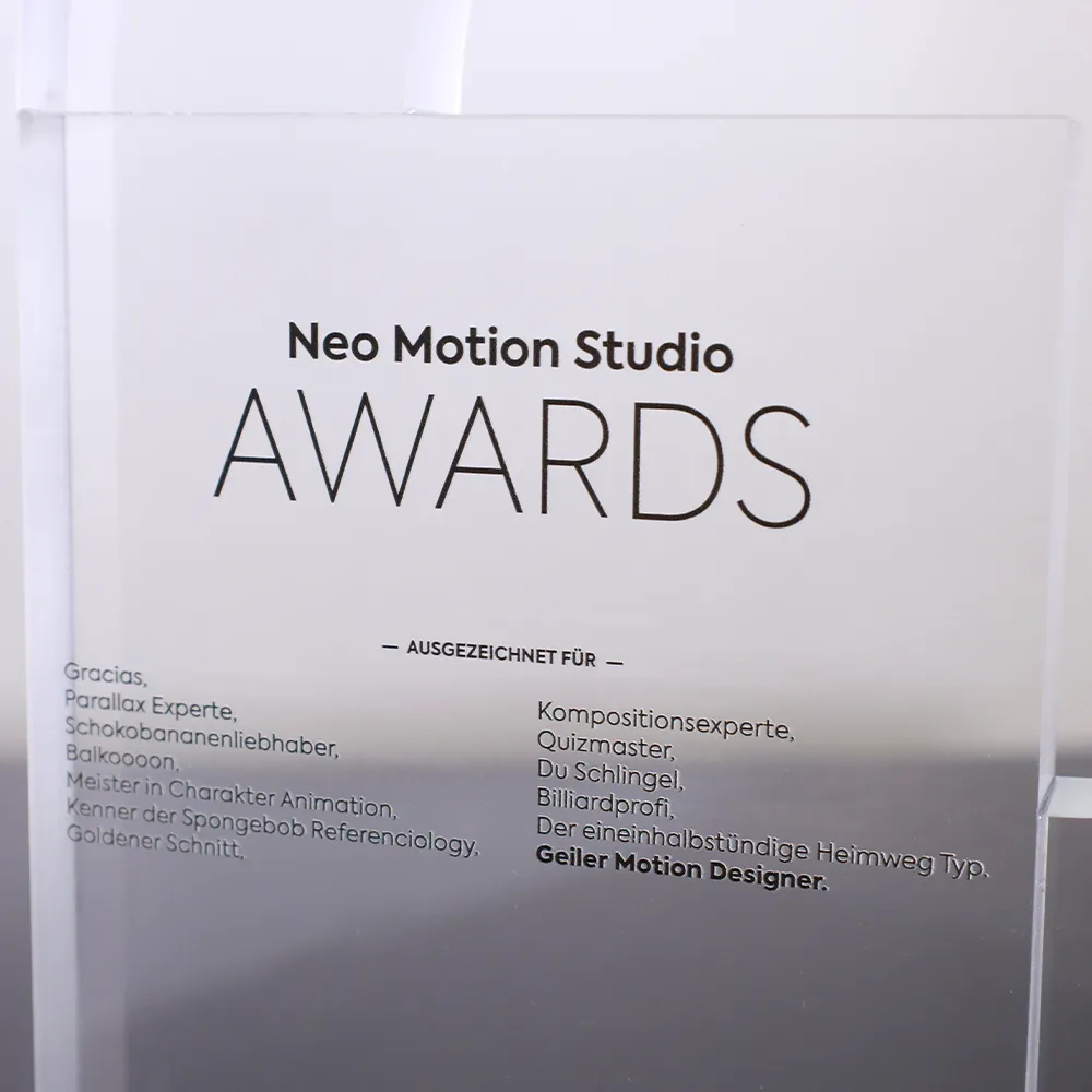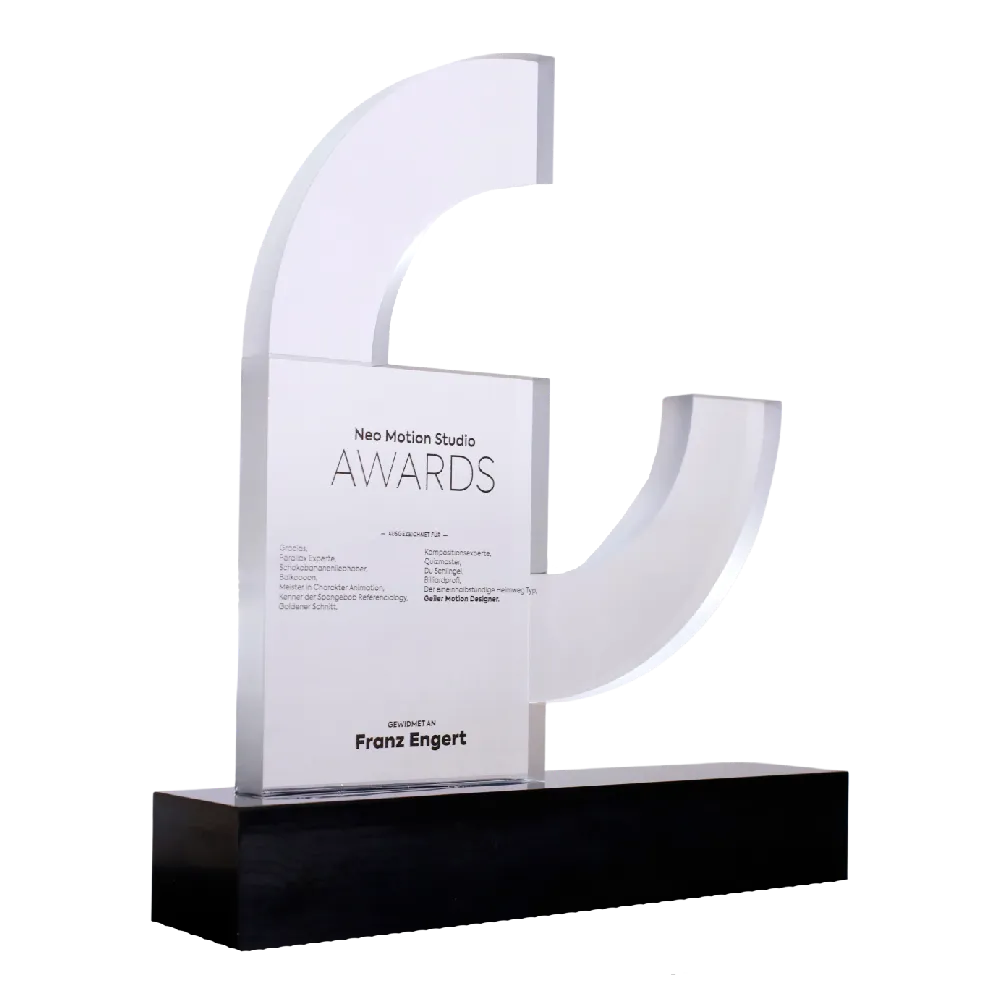 A business trophy crafted for Neo Motion Studio. The award's shape, cut in acrylic, is positioned on a black acrylic base. The trophy's inscriptions were created using black UV printing.