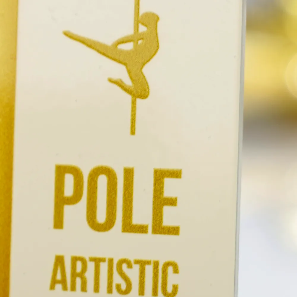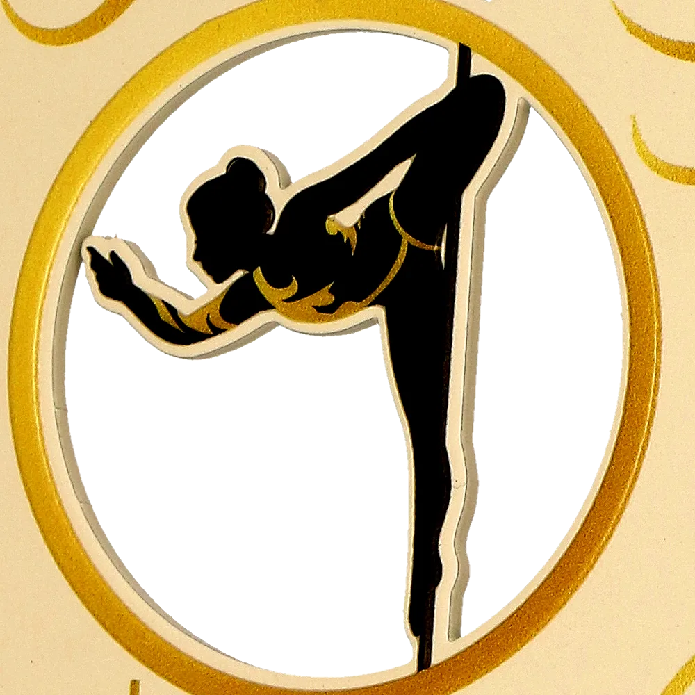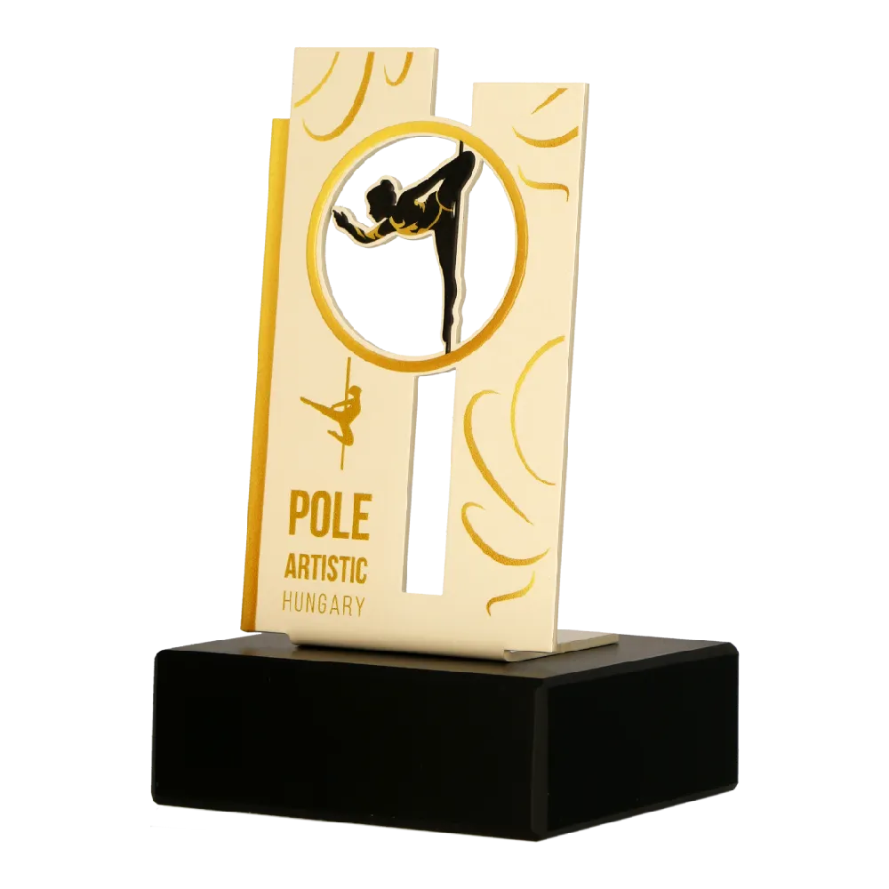 A dance trophy dedicated to the Pole Artistic Hungary competition, distinguished by its modern and artistic design. The awards are made of steel and adorned with gold details and a dynamic silhouette of a pole dancer in the centre. The stable marble base adds elegance to the trophy.