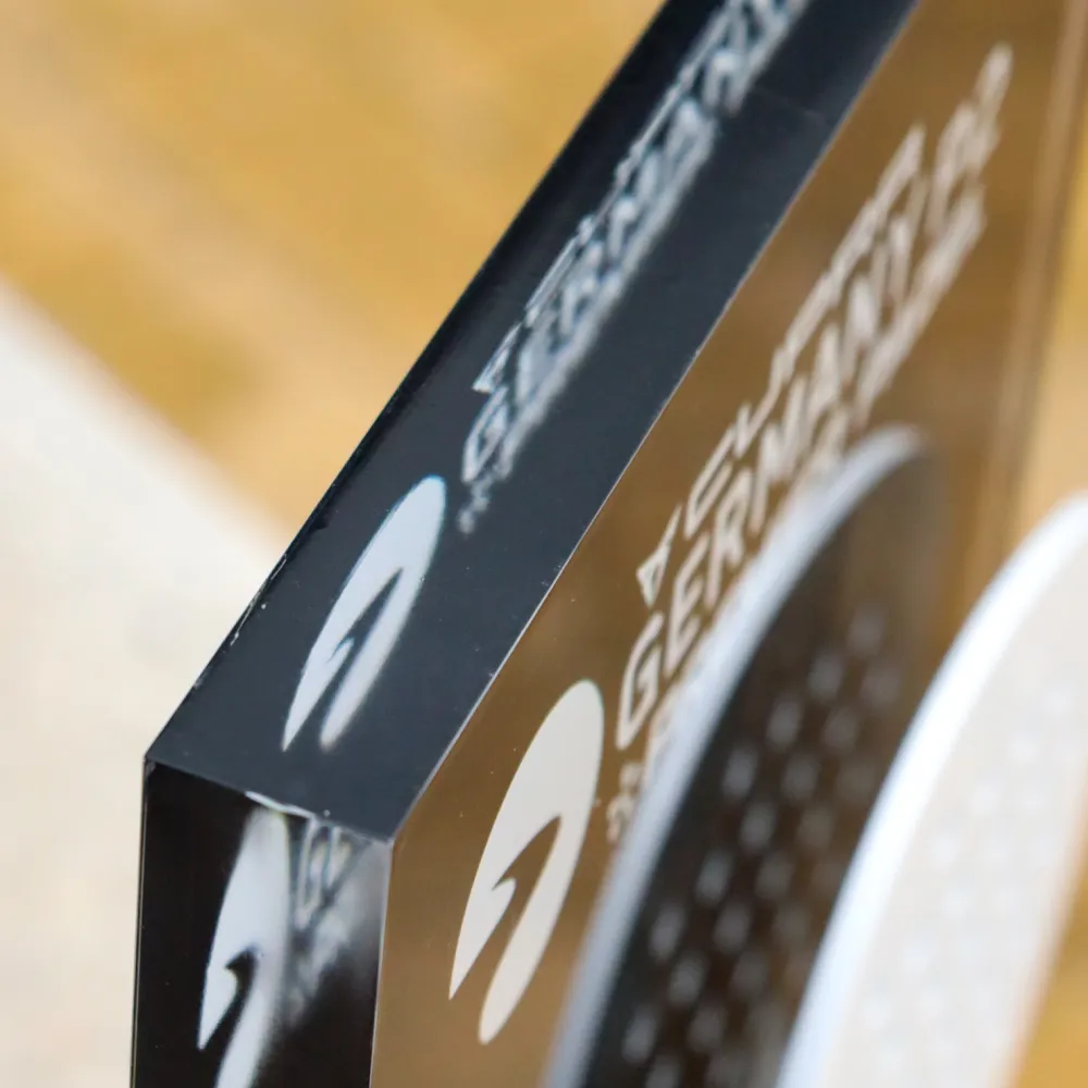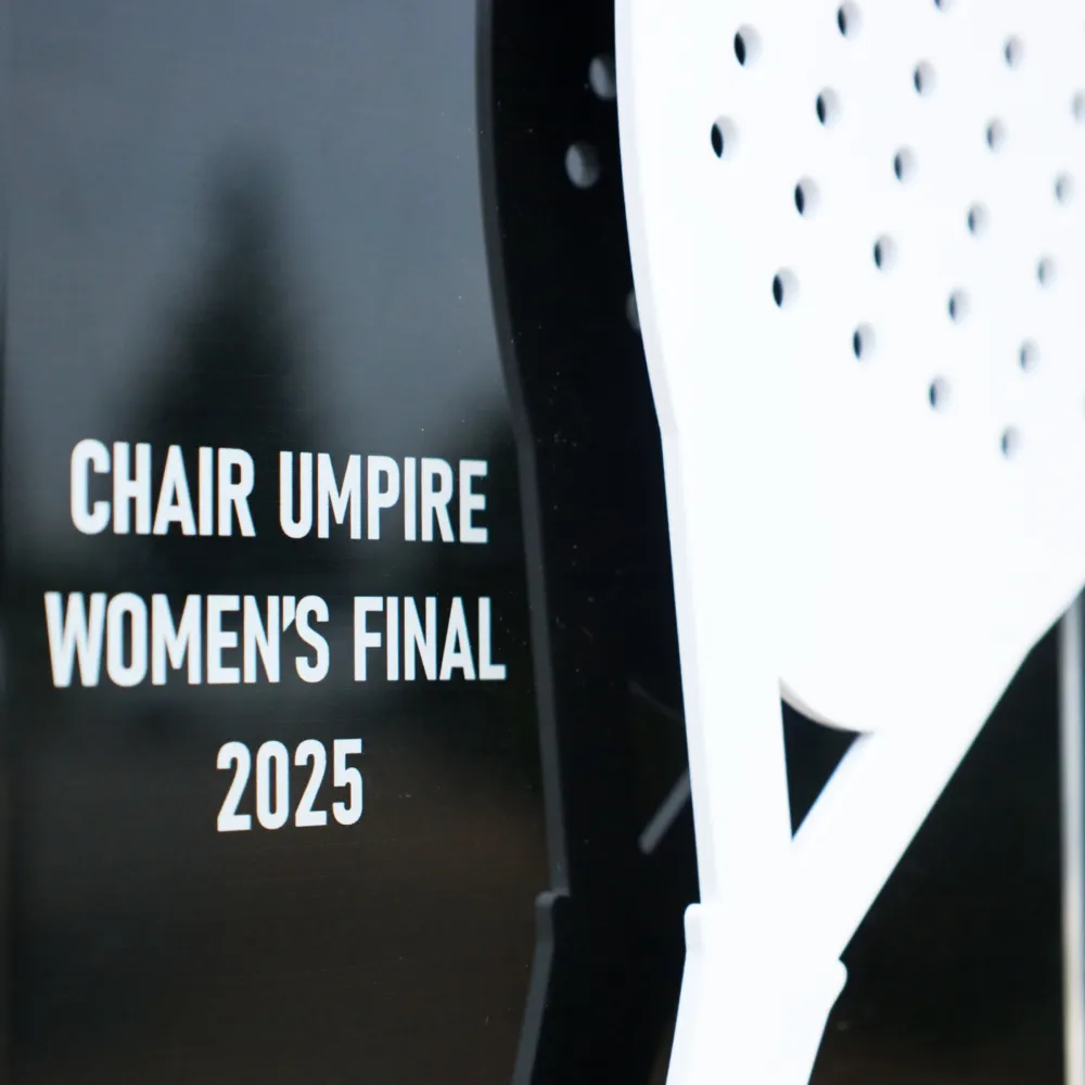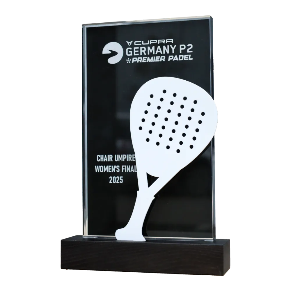 For the organisers of the Premier Padel tournament, we created a multilayered construction where a precision-cut metal padel racket is combined with a clear acrylic panel. The whole piece is permanently mounted on a natural wood base, giving this acrylic award appropriate weight and stability. The application of UV printing technology allowed us to apply branding with photographic accuracy, maintaining colour consistency with the event's visual identity.