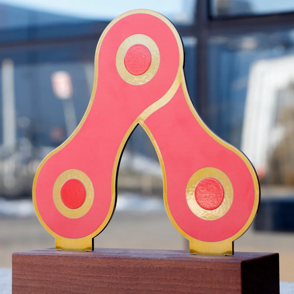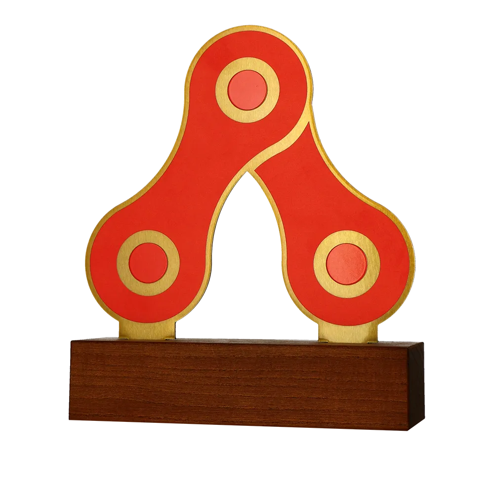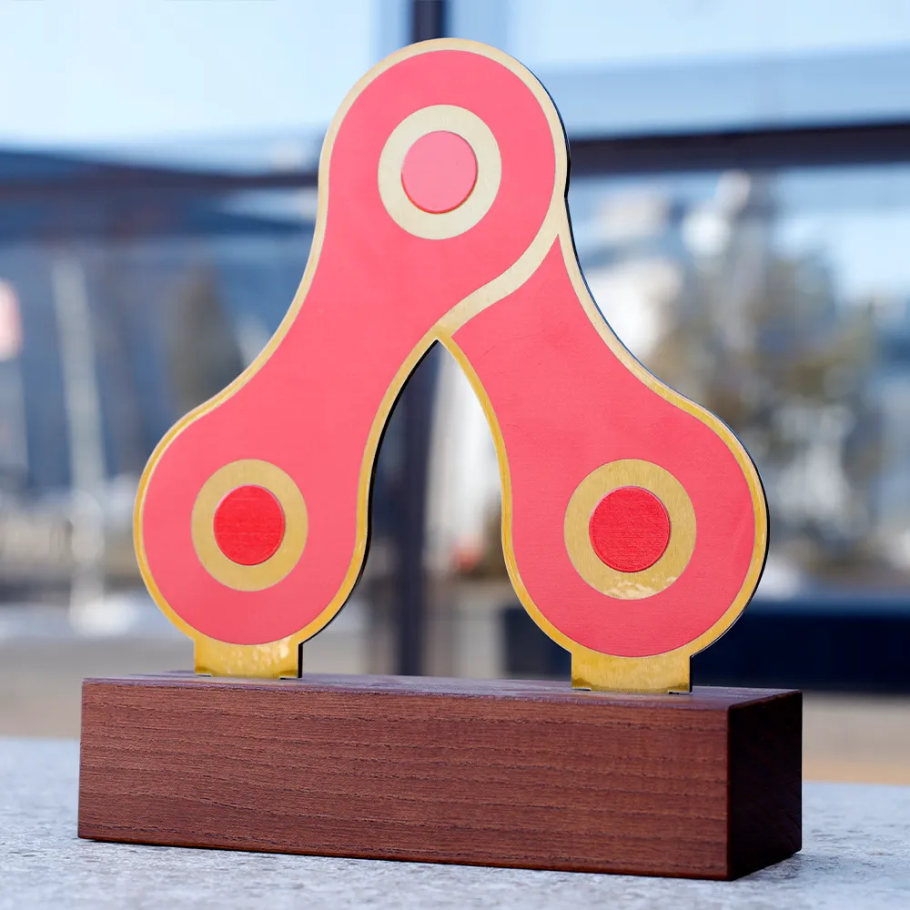 A cycling trophy made of metal and mounted on a wooden base. Designed for the Protour Cyclocross Cup cycling event. The dominant colours are red and gold, referencing the shape of a bicycle chain. It offers the possibility of personalisation by adding the event name, edition, and date.