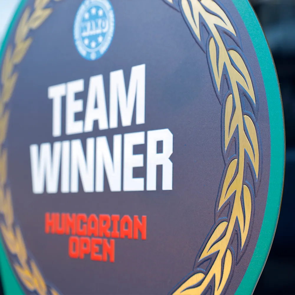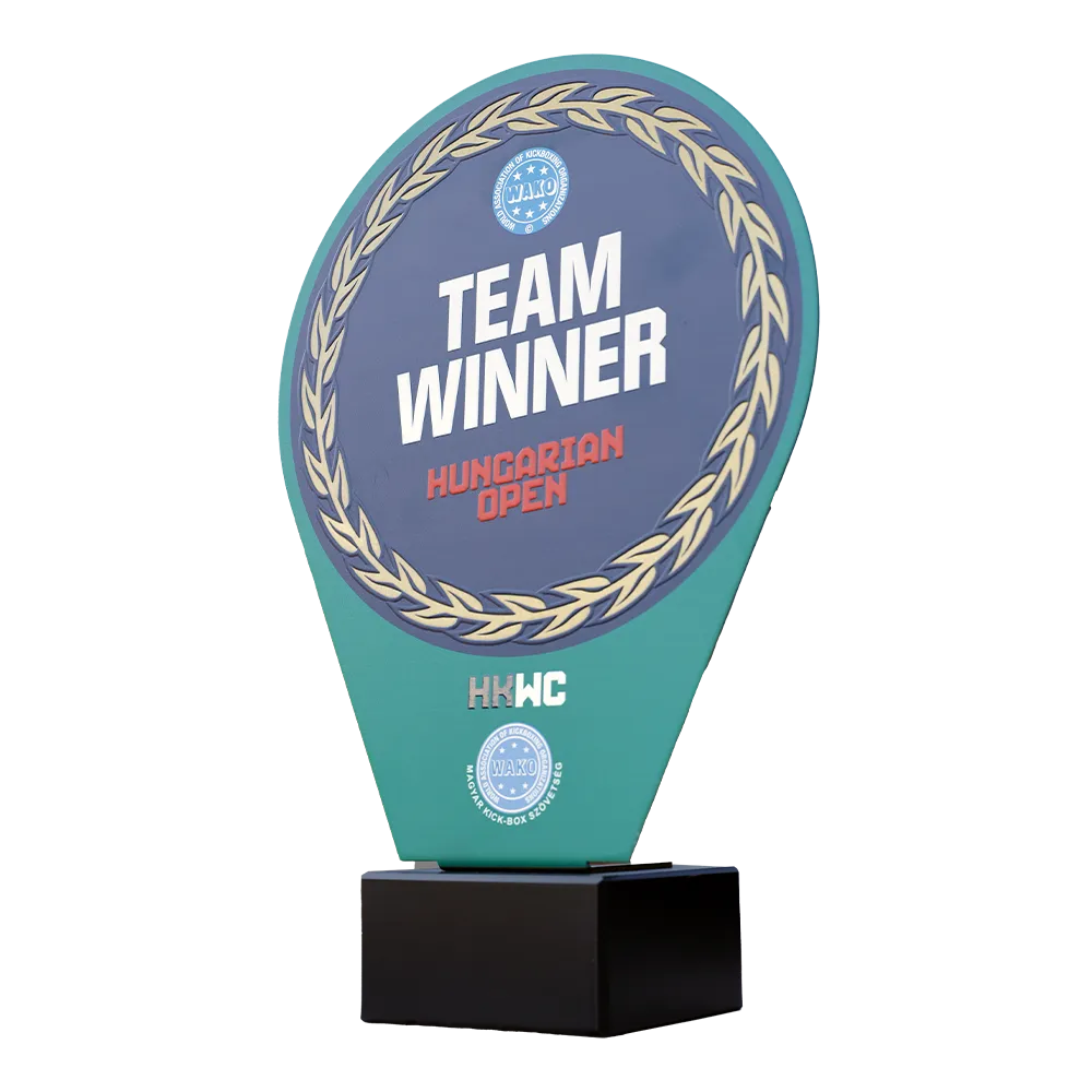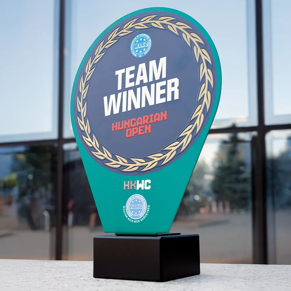Trophy made of metal, set on a marble base. The shape was laser cut, and colourful inscriptions and graphics were applied using UV printing. The design stands out with its simple form, featuring a clear laurel motif and the inscription “Team Winner”. This sports trophy was prepared for a kick-boxing competition.