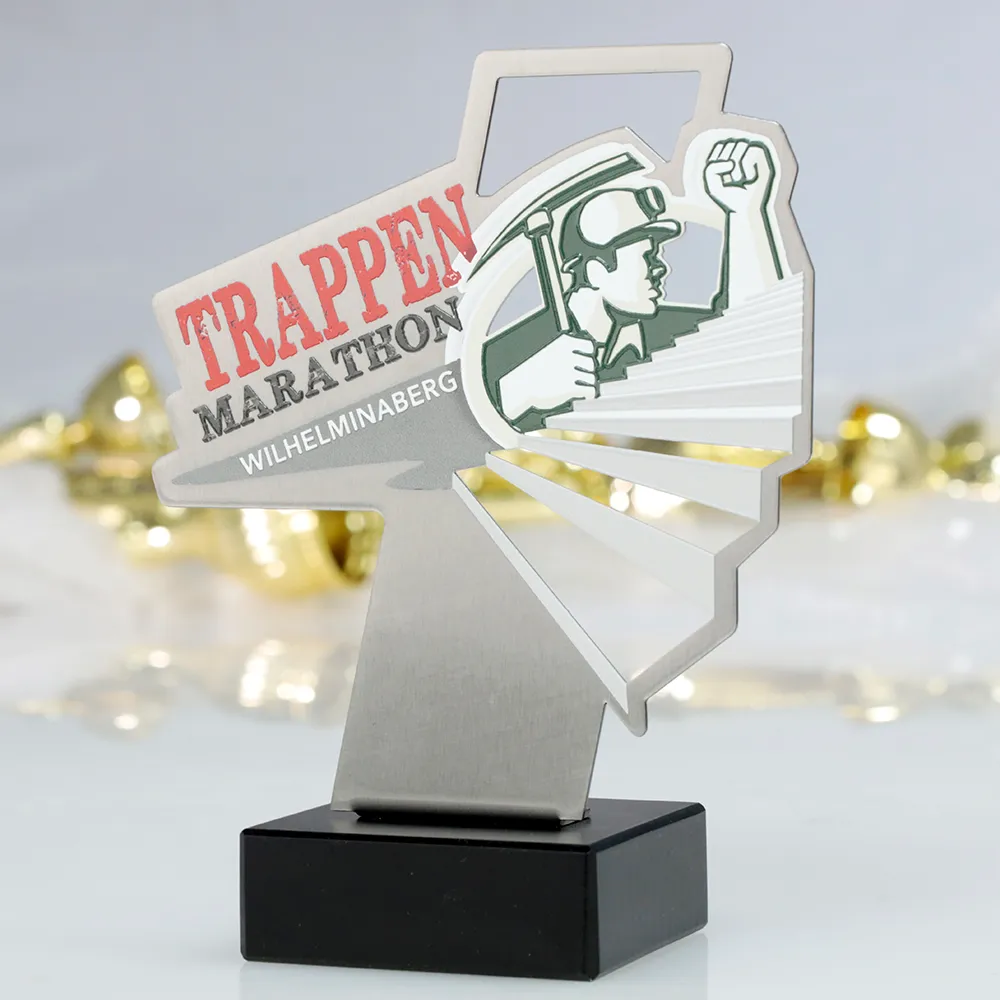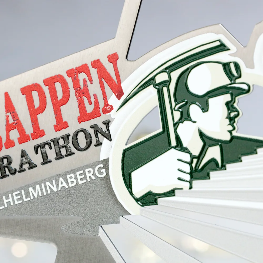 Running award specially designed for the Trappen Marathon held at Wilhelminaberg. The central feature of the design is a graphic of a miner with a pickaxe, reflecting the region's history, combined with a staircase motif. Using laser-cutting technology and UV printing, the graphic details, including the event logo and name, have been perfectly reproduced.