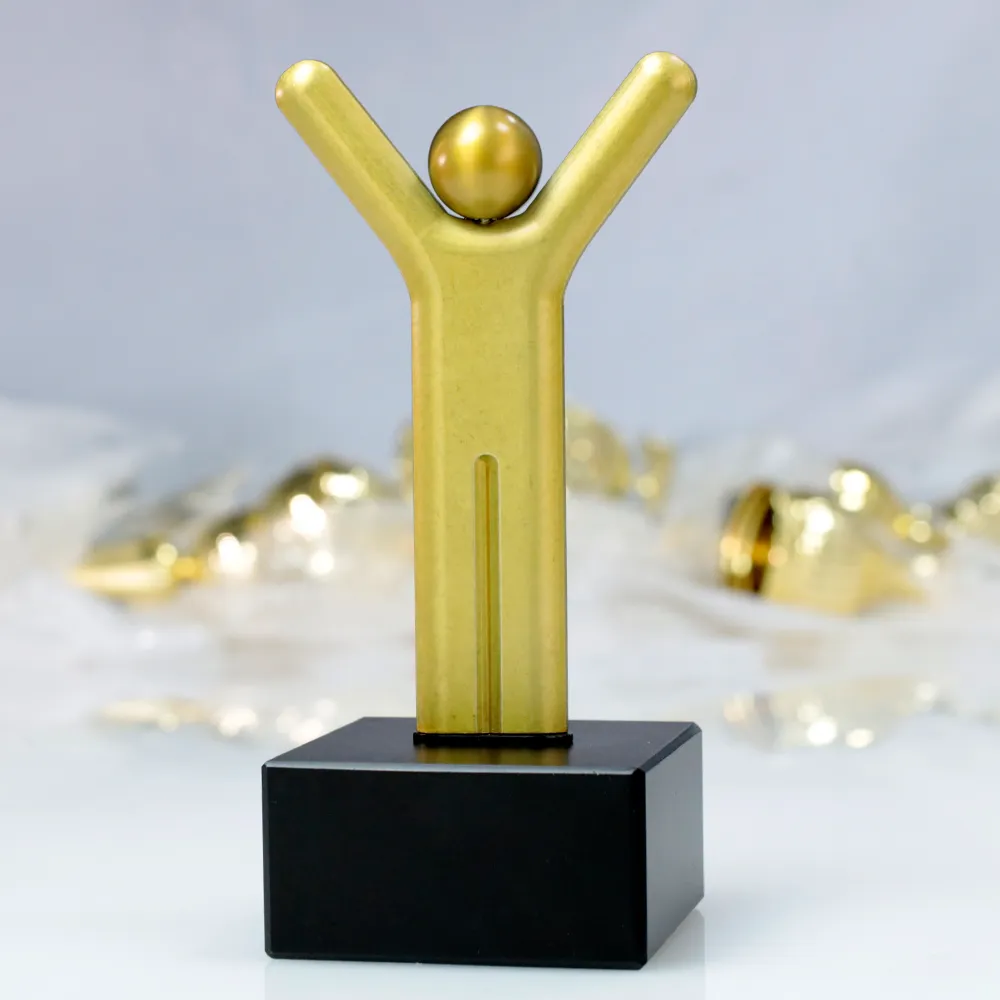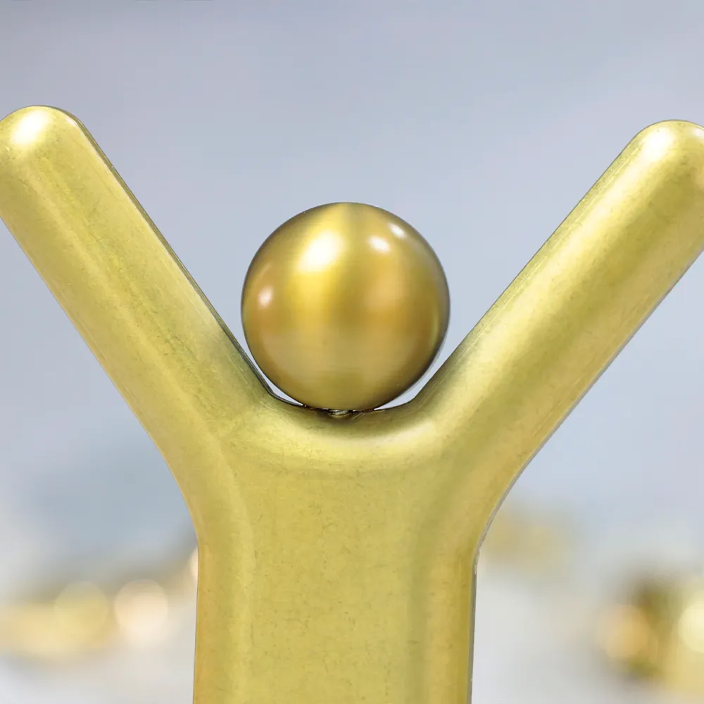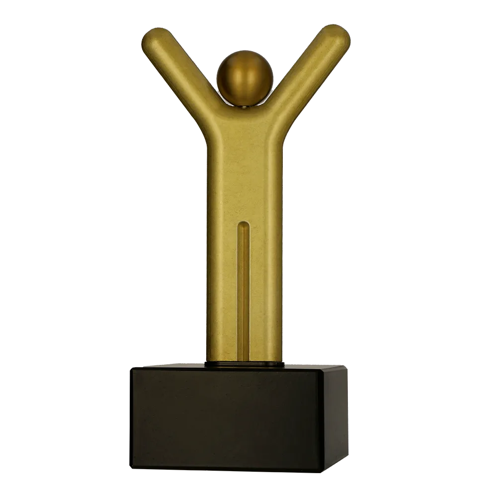 Business award designed as a versatile recognition for winners across various categories and events. It symbolises achievements, success, and triumph. The trophy depicts a stylised figure with raised arms, expressing the joy of accomplishment. The gold finish adds elegance and prestige. The figure is made of durable cast material. Thanks to its universal symbolism, this trophy is ideal for awards in various fields.