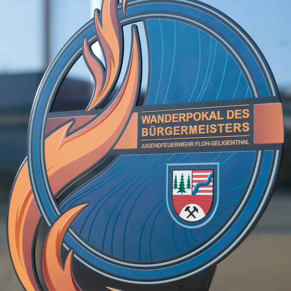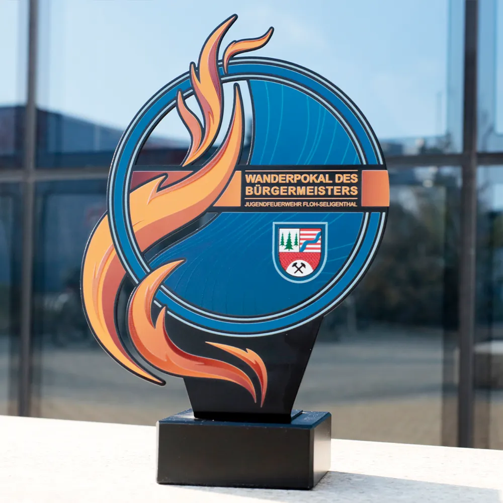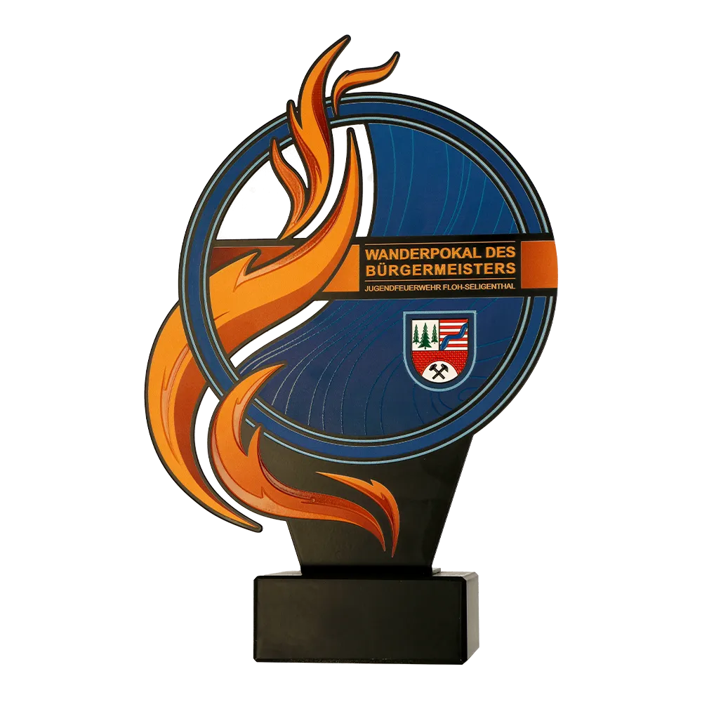 Personalised trophy designed for the youth firefighting competition “Jugendfeuerwehr Floh-Seligenthal.” The combination of local symbols and dynamic design gives the trophy a distinctive appearance, perfectly fitting the theme of youth firefighting competitions.