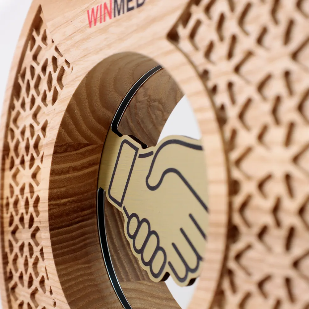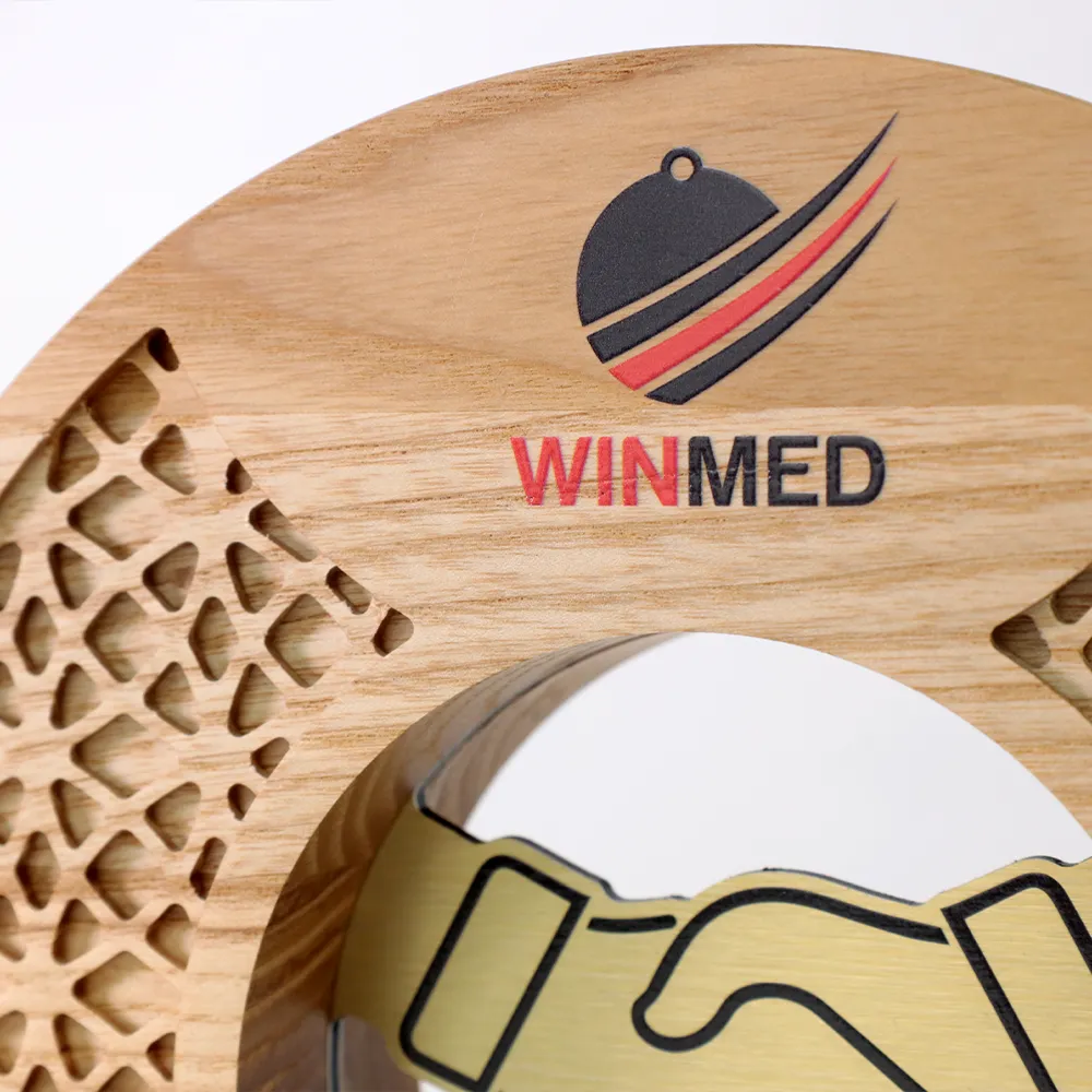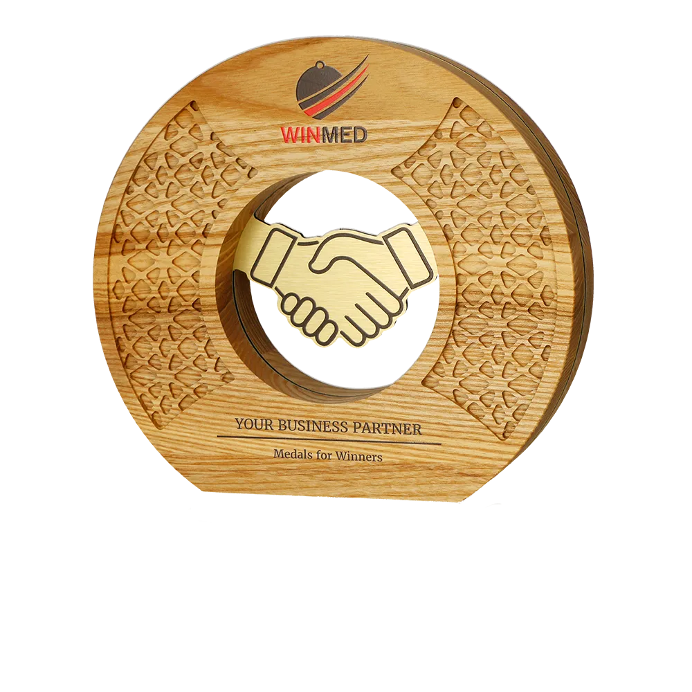 Business award designed as an excellent recognition for business partners or clients, highlighting the importance of business relationships. The trophy has a circular shape made of natural wood. At its centre, a metal handshake symbol emphasises the values of partnership and trust. The UV-printed logo of Winmed and the inscription “Your Business Partner – Medals for Winners” complete the design.